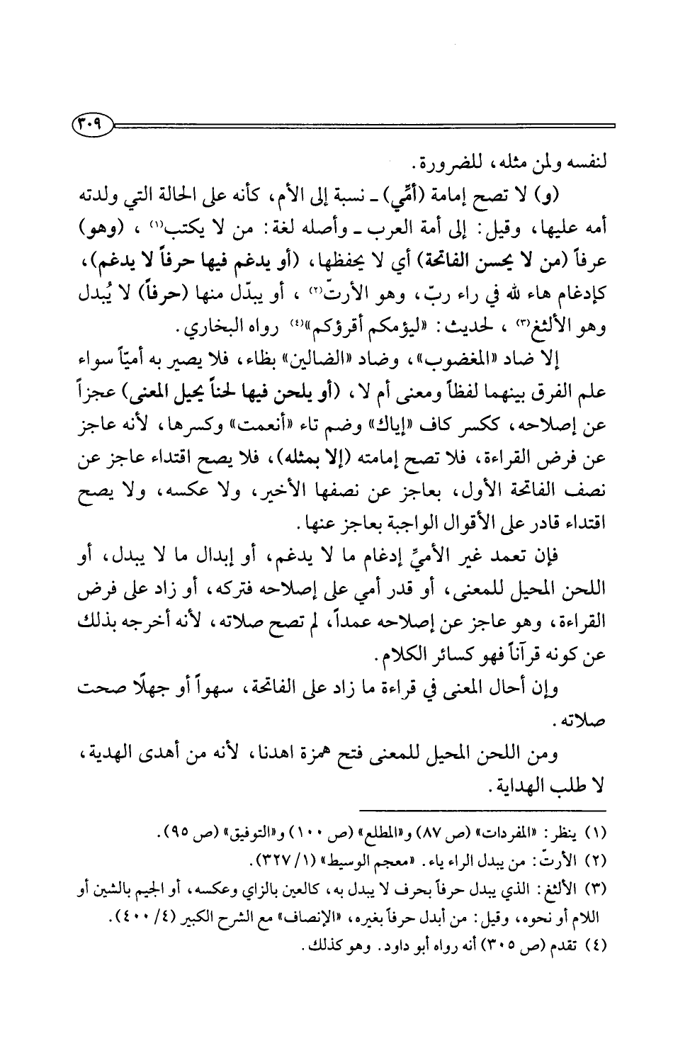 إلا ضاد "المغضوب"، وضاد "الضالين" بظاء، فلا يصير به أميًّا سواء علم الفرق بينهما لفظًا ومعنى أم لا، (أو يلحن فيها لحنًا يحيل المعنى) عجزًا عن إصلاحه، ككسر كاف "إياك" وضم تاء "أنعمت" وكسرها، لأنه عاجز عن فرض القراءة، فلا تصح إمامته (إلا بمثله)، فلا يصح اقتداء عاجز عن نصف الفاتحة الأول، بعاجز عن نصفها الأخير، ولا عكسه، ولا يصح اقتداء قادر على الأقوال الواجبة بعاجز عنها.