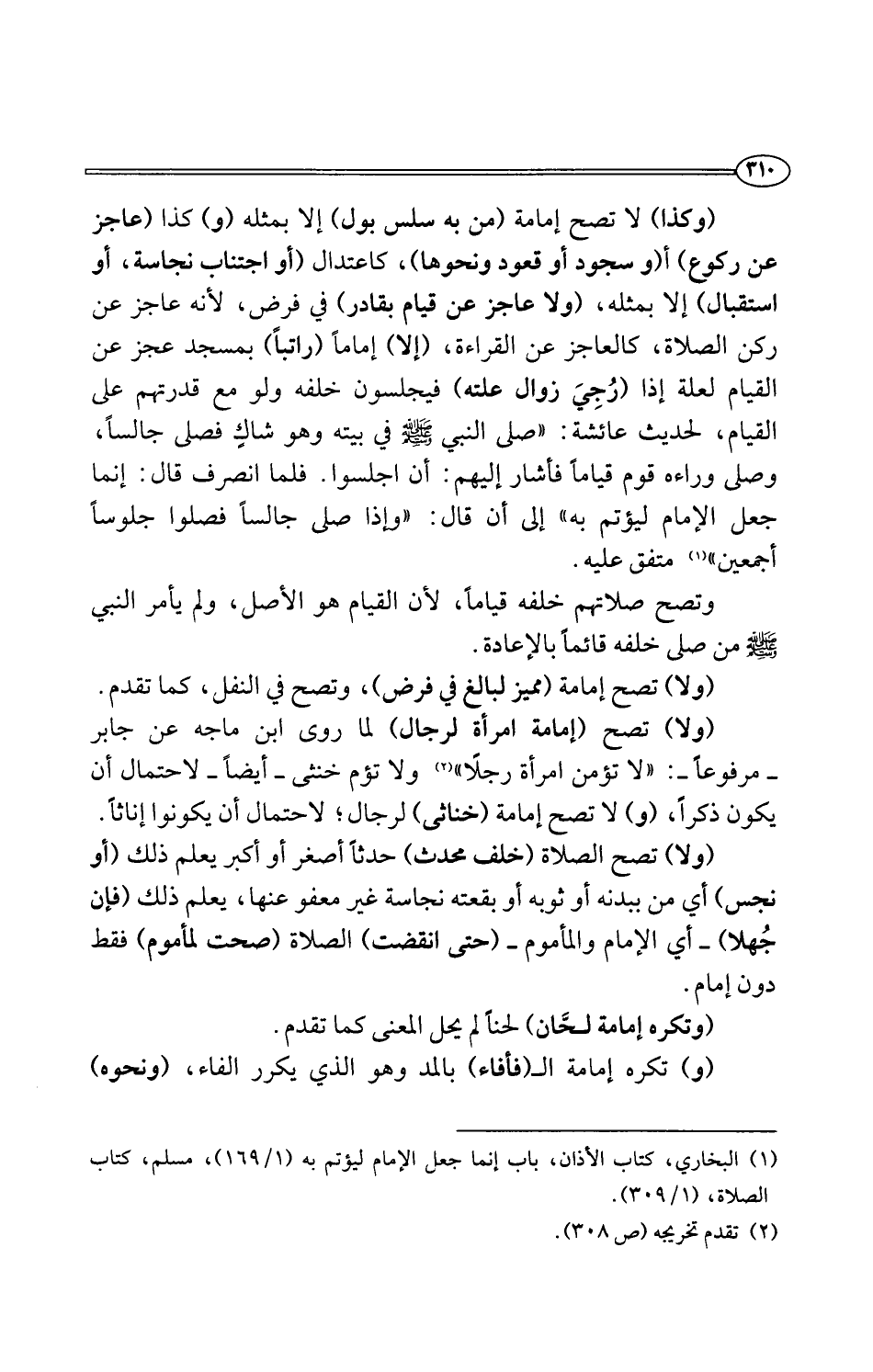 (وكذا) لا تصح إمامة (من به سلس بول) إلا بمثله (و) كذا (عاجز عن ركوع) أ (وسجود أو قعود ونحوها)، كاعتدال (أو اجتناب نجاسة، أو استقبال) إلا بمثله، (ولا عاجز عن قيام بقادر) في فرض، لأنه عاجز عن ركن الصلاة، كالعاجز عن القراءة، (إلا) إمامًا (راتبًا) بمسجد عجز عن القيام لعلة إذا (رُجِيَ زوال علته) فيجلسون خلفه ولو مع قدرتهم على القيام، لحديث عائشة: "صلى النبي -صلى اللَّه عليه وسلم- في بيته وهو شاكٍ فصلى جالسًا، وصلى وراءه قوم قيامًا فأشار إليهم: أن اجلسوا. فلما انصرف قال: إنما جعل الإمام ليؤتم به" إلى أن قال: "وإذا صلى جالسًا فصلوا جلوسًا أجمعين" (¬1) متفق عليه.
