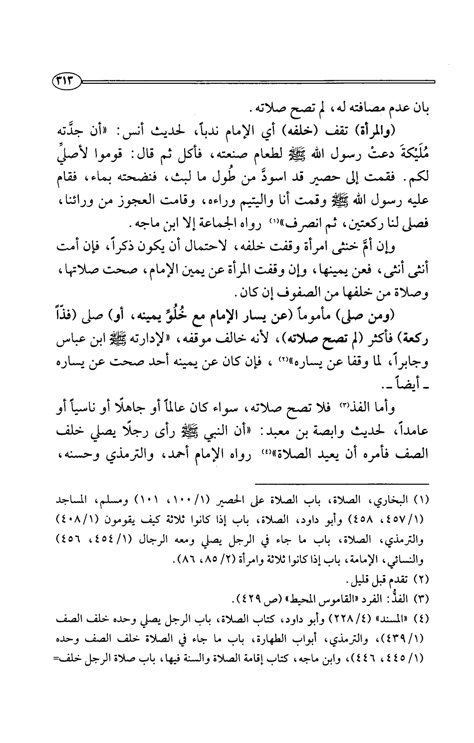 (والمرأة) تقف (خلفه) أي الإمام ندبًا، لحديث أنس: "أن جدَّته مُلَيْكةَ دعتْ رسول اللَّه -صلى اللَّه عليه وسلم- لطعام صنعته، فأكل ثم قال: قوموا لأصلِّي لكم. فقمت إلى حصير قد اسودَّ من طُول ما لبث، فنضحته بماء، فقام عليه رسول اللَّه -صلى اللَّه عليه وسلم- وقمت أنا واليتيم وراءه، وقامت العجوز من ورائنا، فصلى لنا ركعتين، ثم انصرف" (¬1) رواه الجماعة إلا ابن ماجه.