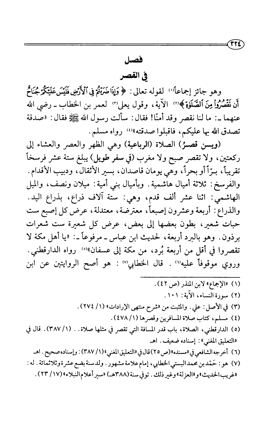 (ويسن قصرُ) الصلاة (الرباعية) وهي الظهر والعصر والعشاء إلى ركعتين، ولا تقصر صبح ولا مغرب (في سفر طويل) يبلغ ستة عشر فرسخًا تقريبًا، برًّا أو بحرًا، وهي يومان قاصدان، بسير الأثقال، ودبيب الأقدام. والفرسخ: ثلاثة أميال هاشمية. وبأميال بني أمية: ميلان ونصف، والميل الهاشمي: اثنا عشر ألف قدم، وهي: ستة آلاف ذراع، بذراع اليد. والذراع: أربعة وعشرون إصبعًا، معترضة، معتدلة، عرض كل إصبع ست حبات شعير، بطون بعضها إلى بعض، عرض كل شعيرة ست شعرات برذون. وهو بالبرد أربعة، لحديث ابن عباس -مرفوعًا-: "يا أهل مكة لا تقصروا في أقل من أبيبعة بُرد، من مكة إلى عسفان" (¬5) رواه الدارقطني. وروي موقوفًا عليه (¬6). قال الخطابي (¬7): هو أصح الروايتين عن ابن