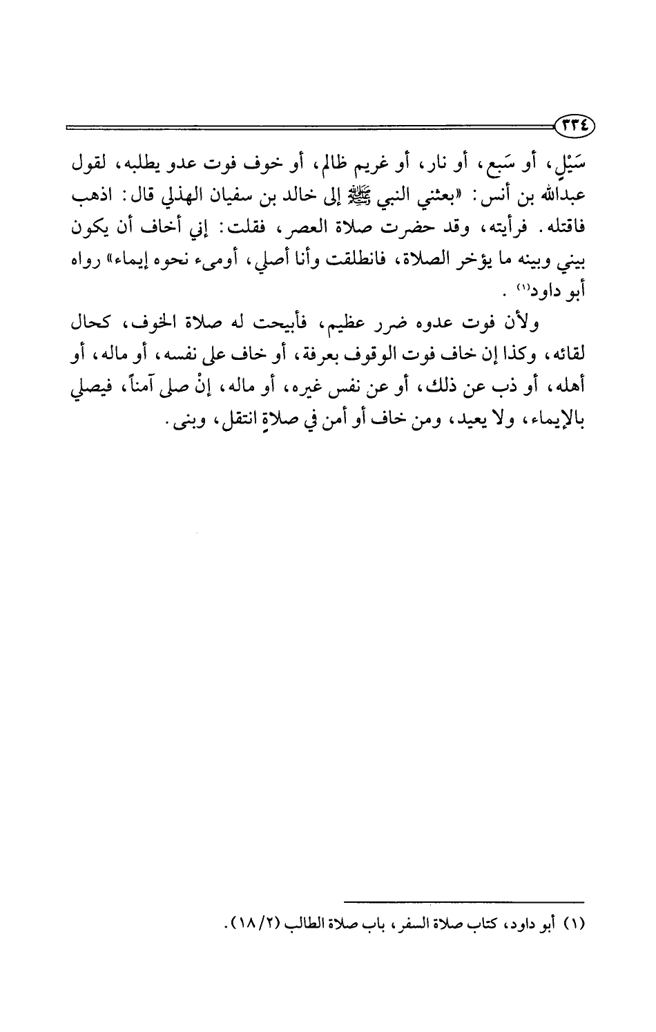 سَيْلٍ، أو سَبع، أو نار، أو غريم ظالم، أو خوف فوت عدو يطلبه، لقول عبد اللَّه بن أنس: "بعثني النبي -صلى اللَّه عليه وسلم- إلى خالد بن سفيان الهذلي قال: اذهب فاقتله. فرأيته، وقد حضرت صلاة العصر، فقلت: إني أخاف أن يكون بيني وبينه ما يؤخر الصلاة، فانطلقت وأنا أصلي، أومئ نحوه إيماء" رواه أبو داود (¬1).