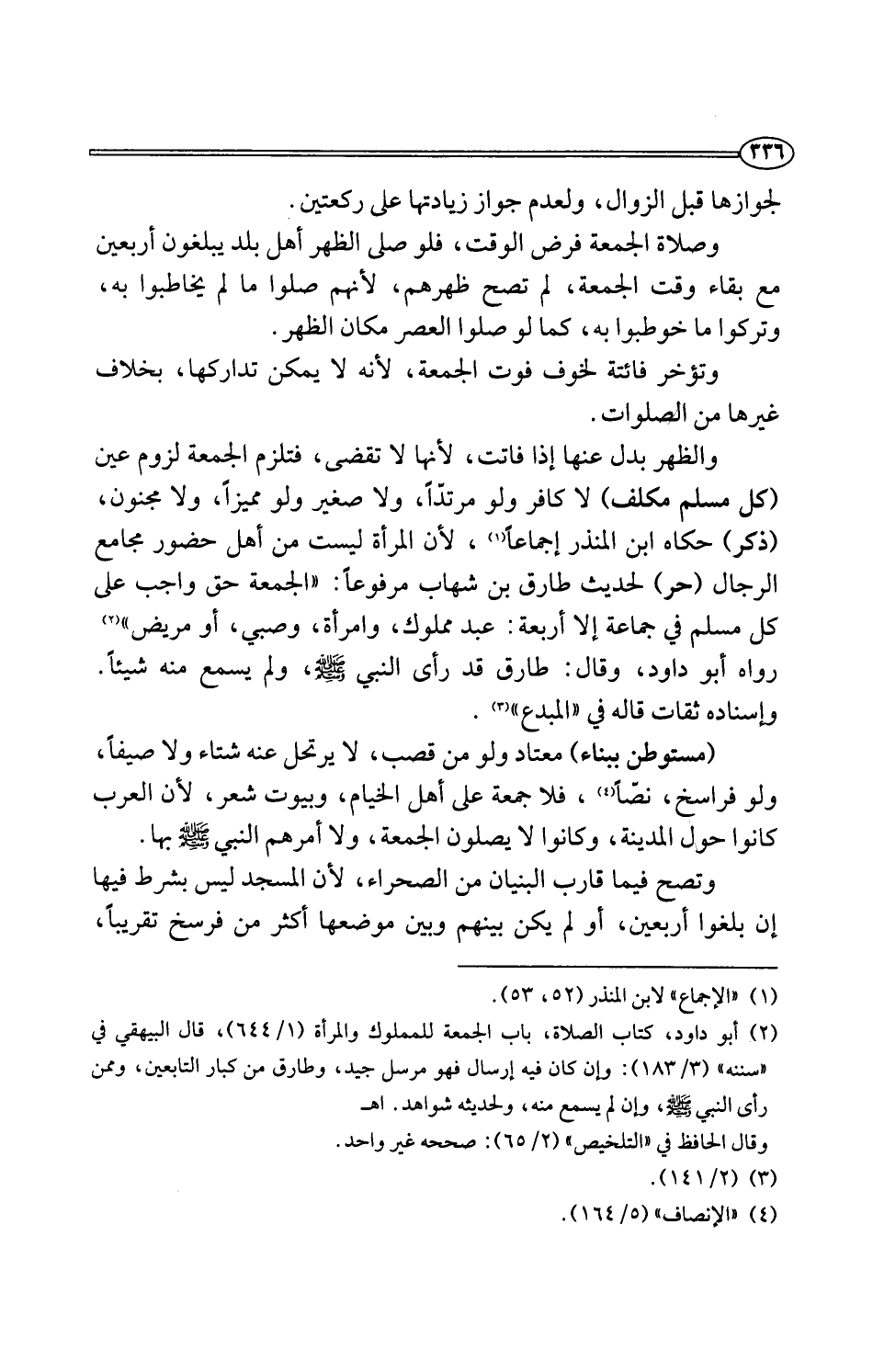 والظهر بدل عنها إذا فاتت، لأنها لا تقضى، فتلزم الجمعة لزوم عين (كل مسلم مكلف) لا كافر ولو مرتدًّا، ولا صغير ولو مميزًا، ولا مجنون، (ذكر) حكاه ابن المنذر إجماعًا (¬1)، لأن المرأة ليست من أهل حضور مجامع الرجال (حر) لحديث طارق بن شهاب مرفوعًا: "الجمعة حق واجب على كل مسلم في جماعة إلا أربعة: عبد مملوك، وامرأة، وصبي، أو مريض" (¬2) رواه أبو داود، وقال: طارق قد رأى النبي -صلى اللَّه عليه وسلم-، ولم يسمع منه شيئًا. وإسناده ثقات قاله في "المبدع" (¬3).