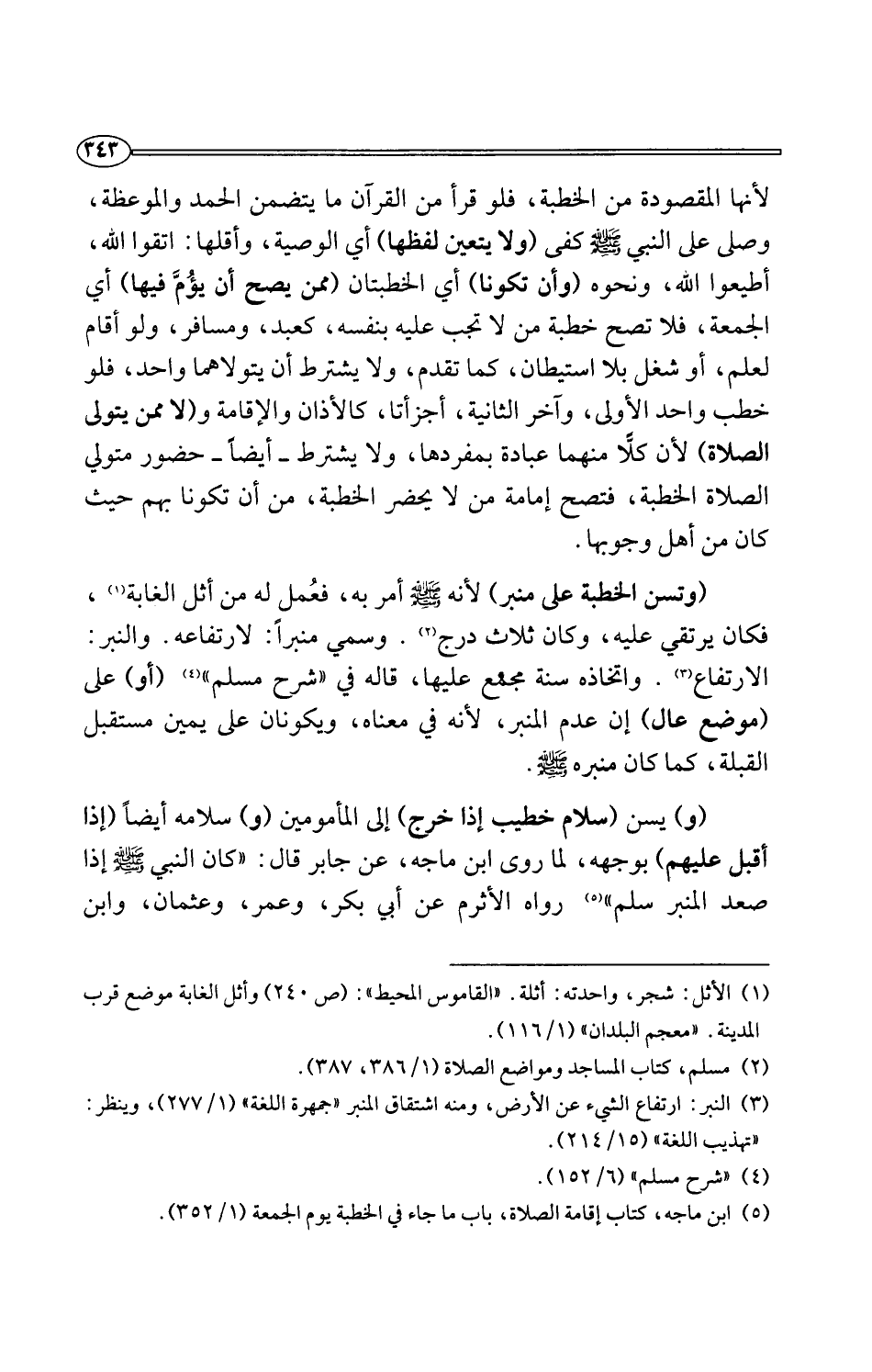 (وتسن الخطبة على منبر) لأنه -صلى اللَّه عليه وسلم- أمر به، فعُمل له من أثل الغابة (¬1)، فكان يرتقي عليه، وكان ثلاث درج (¬2). وسمي منبرًا: لارتفاعه. والنبر: الارتفاع (¬3). واتخاذه سنة مجمع عليها، قاله في "شرح مسلم" (¬4) (أو) على (موضع عال) إن عدم المنبر؛ لأنه في معناه، ويكونان على يمين مستقبل القبلة، كما كان منبره -صلى اللَّه عليه وسلم-.