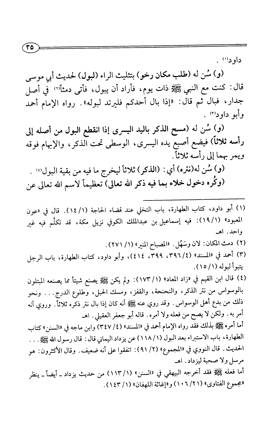 (¬4) قال ابن القيم في "زاد المعاد" (1/ 173): ولم يكن -صلى اللَّه عليه وسلم- يصنع شيئًا مما يصنعه المبتلون بالوسواس من نتر الذكر، والنحنحة، والقفز، ومسك الحبل، وطلوع الدرج. . . ونحو ذلك من بدع أهل الوسواس. وقد روي عنه -صلى اللَّه عليه وسلم- أنه كان إذا بال نتر ذكره ثلاثًا. وروي أنه أمر به. ولكن لا يصح من فعله ولا أمره. قاله أبو جعفر العقيلي. اهـ