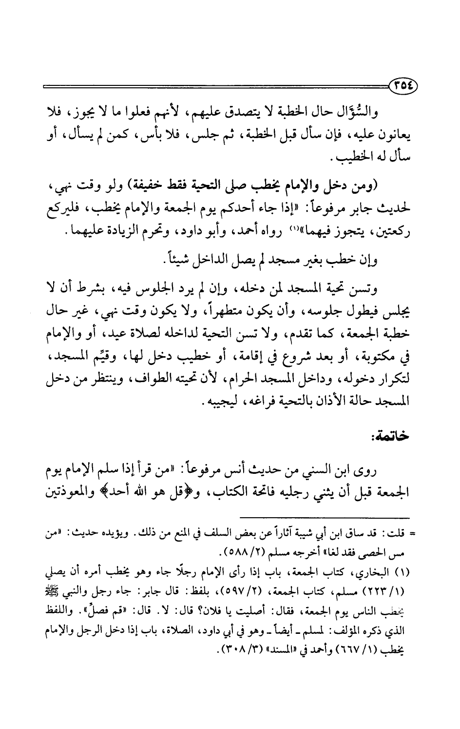 وتسن تحية المسجد لمن دخله، وإن لم يرد الجلوس فيه، بشرط أن لا يجلس فيطول جلوسه، وأن يكون متطهرًا، ولا يكون وقت نهي، غير حال خطبة الجمعة، كما تقدم، ولا تسن التحية لداخله لصلاة عيد، أو والإمام في مكتوبة، أو بعد شروع في إقامة، أو خطيب دخل لها، وقيِّم المسجد، لتكرار دخوله، وداخل المسجد الحرام، لأن تحيته الطواف، وينتظر من دخل المسجد حالة الأذان بالتحية فراغه، ليجيبه.
