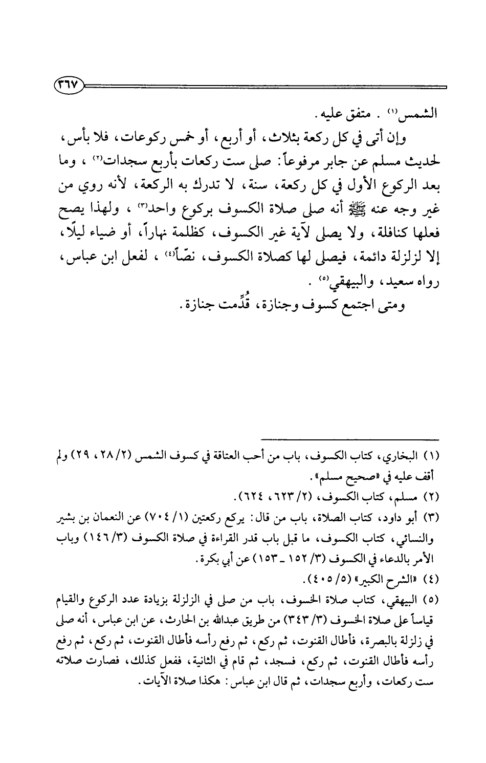 (¬3) أبو داود، كتاب الصلاة، باب من قال: يركع ركعتين (1/ 704) عن النعمان بن بشير والنسائي، كتاب الكسوف، ما قبل باب قدر القراءة في صلاة الكسوف (3/ 146) وباب الأمر بالدعاء في الكسوف (3/ 152 - 153) عن أبي بكرة.