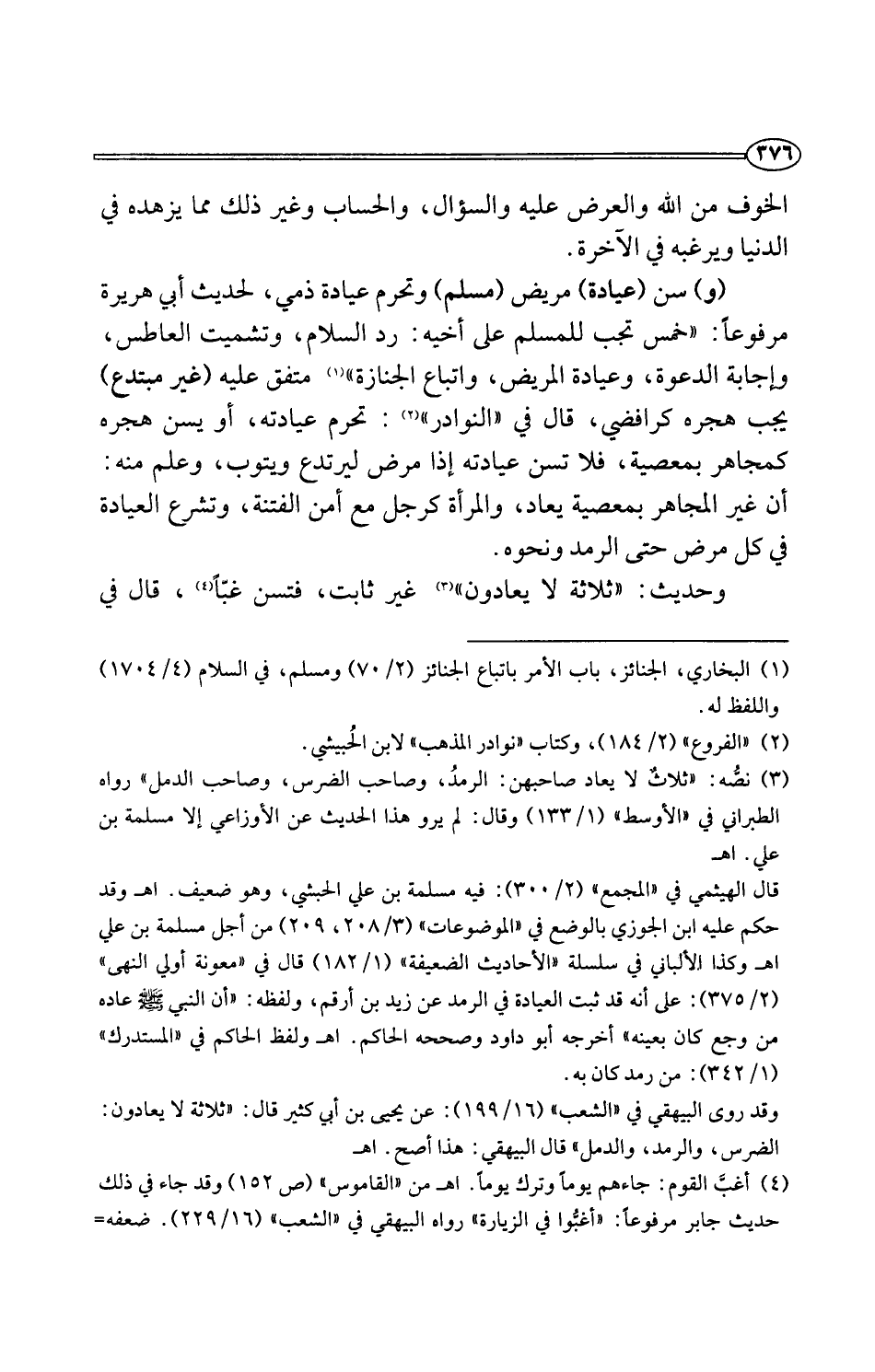 (¬3) نصُّه: "ثلاثٌ لا يعاد صاحبهن: الرمدُ، وصاحب الضرس، وصاحب الدمل" رواه الطبراني في "الأوسط" (1/ 133) وقال: لم يرو هذا الحديث عن الأوزاعي إلا مسلمة بن علي. اهـ