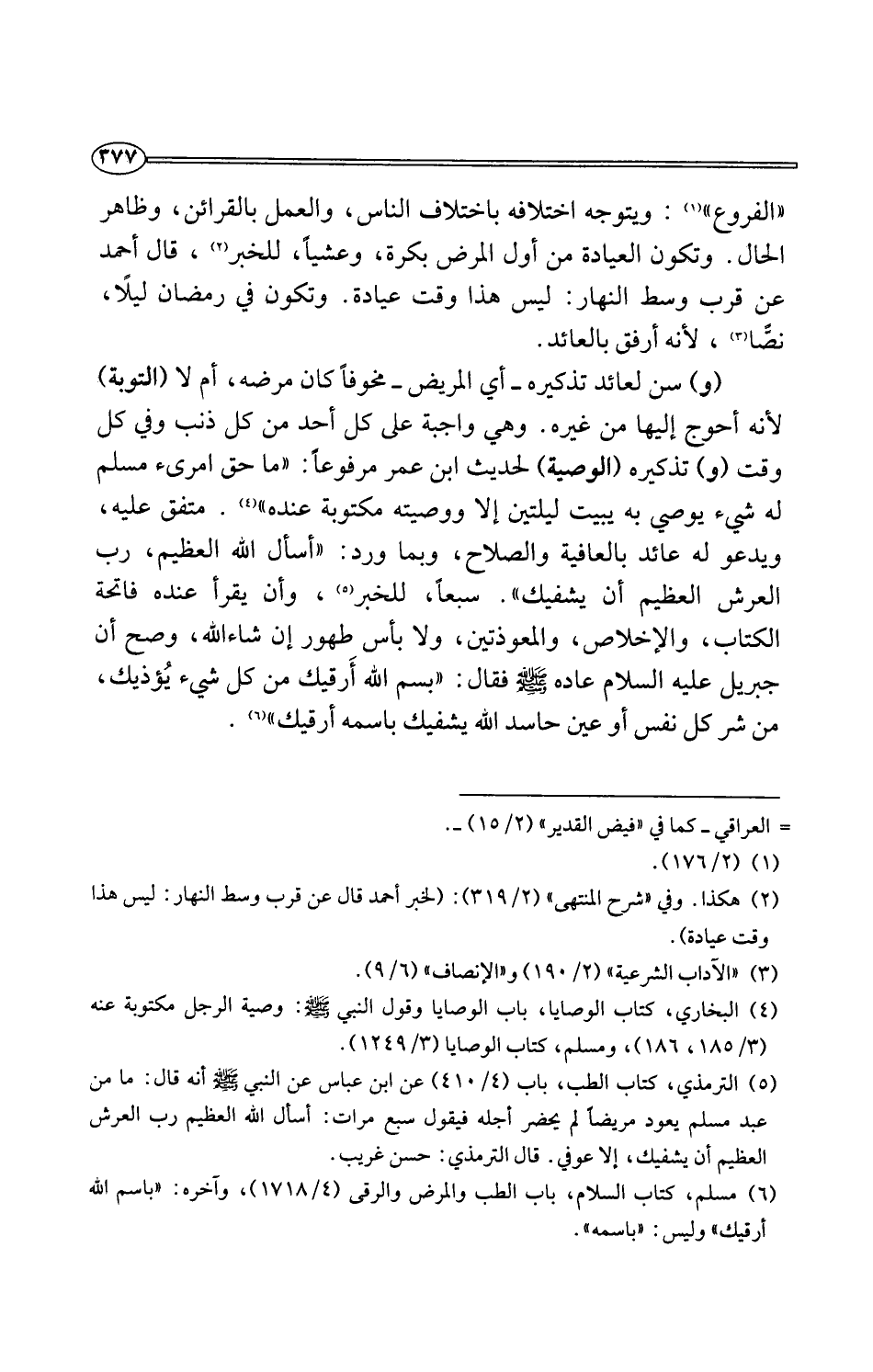 (¬5) الترمذي، كتاب الطب، باب (4/ 410) عن ابن عباس عن النبي -صلى اللَّه عليه وسلم- أنه قال: ما من عبد مسلم يعود مريضًا لم يحضر أجله فيقول سبع مرات: أسال اللَّه العظيم رب العرش العظيم أن يشفيك، إلا عوفي. قال الترمذي: حسن غريب.