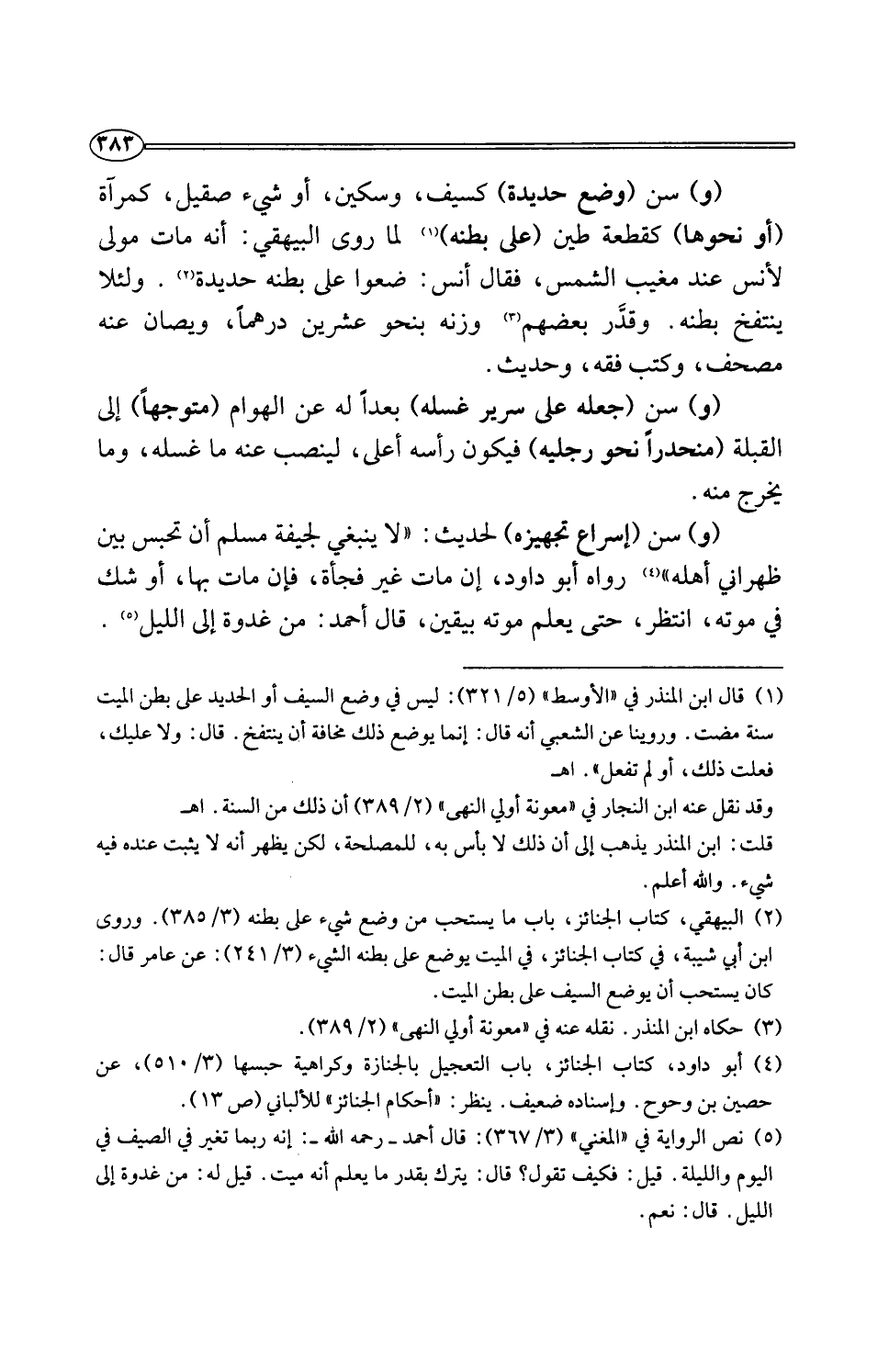 (¬1) قال ابن المنذر في "الأوسط" (5/ 321): ليس في وضع السيف أو الحديد على بطن الميت سنة مضت. وروينا عن الشعبي أنه قال: إنما يوضع ذلك مخافة أن ينتفخ. قال: ولا عليك، فعلت ذلك، أو لم تفعل". اهـ