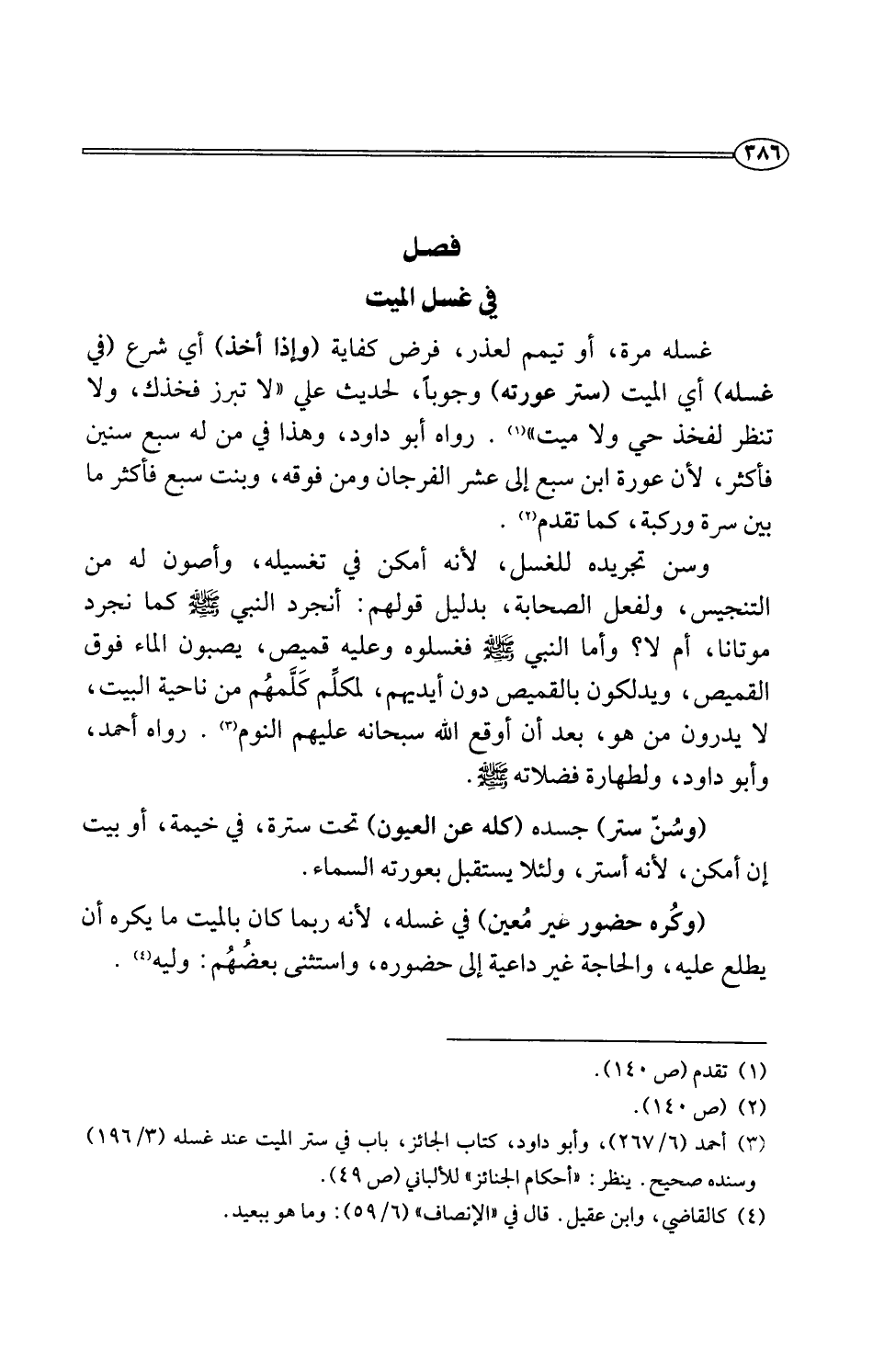 وسن تجريده للغسل، لأنه أمكن في تغسيله، وأصون له من التنجيس، ولفعل الصحابة، بدليل قولهم: أنجرد النبي -صلى اللَّه عليه وسلم- كما نجرد موتانا، أم لا؟ وأما النبي -صلى اللَّه عليه وسلم- فغسلوه وعليه قميص، يصبون الماء فوق القميص، ويدلكون بالقميص دون أيديهم، لمكلِّم كَلَّمهُم من ناحية البيت، لا يدرون من هو، بعد أن أوقع اللَّه سبحانه عليهم النوم (¬3). رواه أحمد، وأبو داود، ولطهارة فضلاته -صلى اللَّه عليه وسلم-.