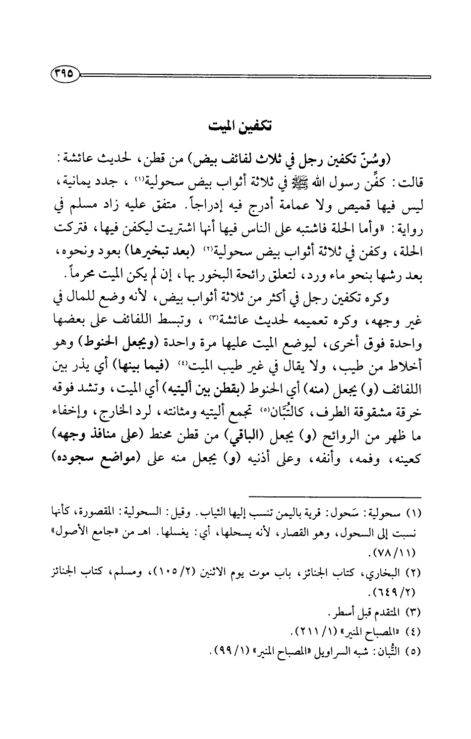(وسُنّ تكفين رجل في ثلاث لفائف بيض) من قطن، لحديث عائشة: قالت: كفِّن رسول اللَّه -صلى اللَّه عليه وسلم- في ثلاثة أثواب بيض سحولية (¬1)، جدد يمانية، ليس فيها قميص ولا عمامة أدرج فيه إدراجًا. متفق عليه زاد مسلم في رواية: "وأما الحلة فاشتبه على الناس فيها أنها اشتريت ليكفن فيها، فتركت الحلة، وكفن في ثلاثة أثواب بيض سحولية (¬2) (بعد تبخيرها) بعود ونحوه، بعد رشها بنحو ماء ورد، لتعلق رائحة البخور بها، إن لم يكن الميت محرمًا.