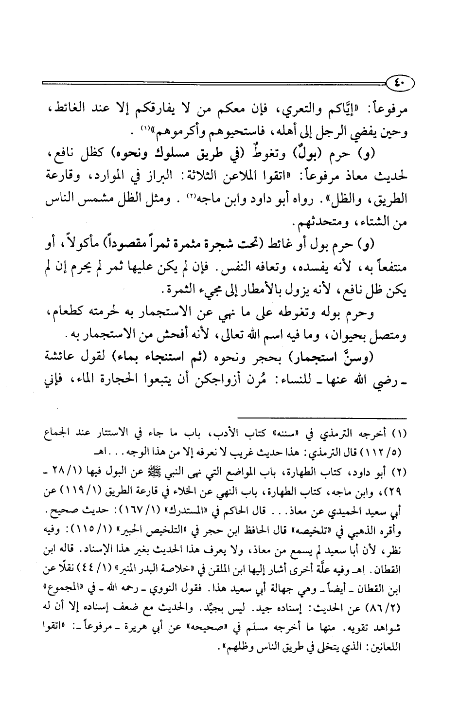 (¬2) أبو داود، كتاب الطهارة، باب المواضع التي نهى النبي -صلى اللَّه عليه وسلم- عن البول فيها (1/ 28 - 29)، وابن ماجه، كتاب الطهارة، باب النهي عن الخلاء في قارعة الطريق (1/ 119) عن أبي سعيد الحميدي عن معاذ. . . قال الحاكم في "المستدرك" (1/ 167): حديث صحيح. وأقره الذهبي في "تلخيصه" قال الحافظ ابن حجر في "التلخيص الحبير" (1/ 115): وفيه نظر، لأن أبا سعيد لم يسمع من معاذ، ولا يعرف هذا الحديث بغير هذا الإسناد. قاله ابن القطان. اهـ وفيه علة أخرى أشار إليها ابن الملقن في "خلاصة البدر المنير" (1/ 44) نقلًا عن ابن القطان -أيضًا- وهي جهالة أبي سعيد هذا. فقول النووي -رحمه اللَّه- في "المجموع" (2/ 86) عن الحديث: إسناده جيد. ليس بجيِّد. والحديث مع ضعف إسناده إلا أن له شواهد تقويه. منها ما أخرجه مسلم في "صحيحه" عن أبي هريرة -مرفوعًا-: "اتقوا اللعانين: الذي يتخلى في طريق الناس وظلهم".