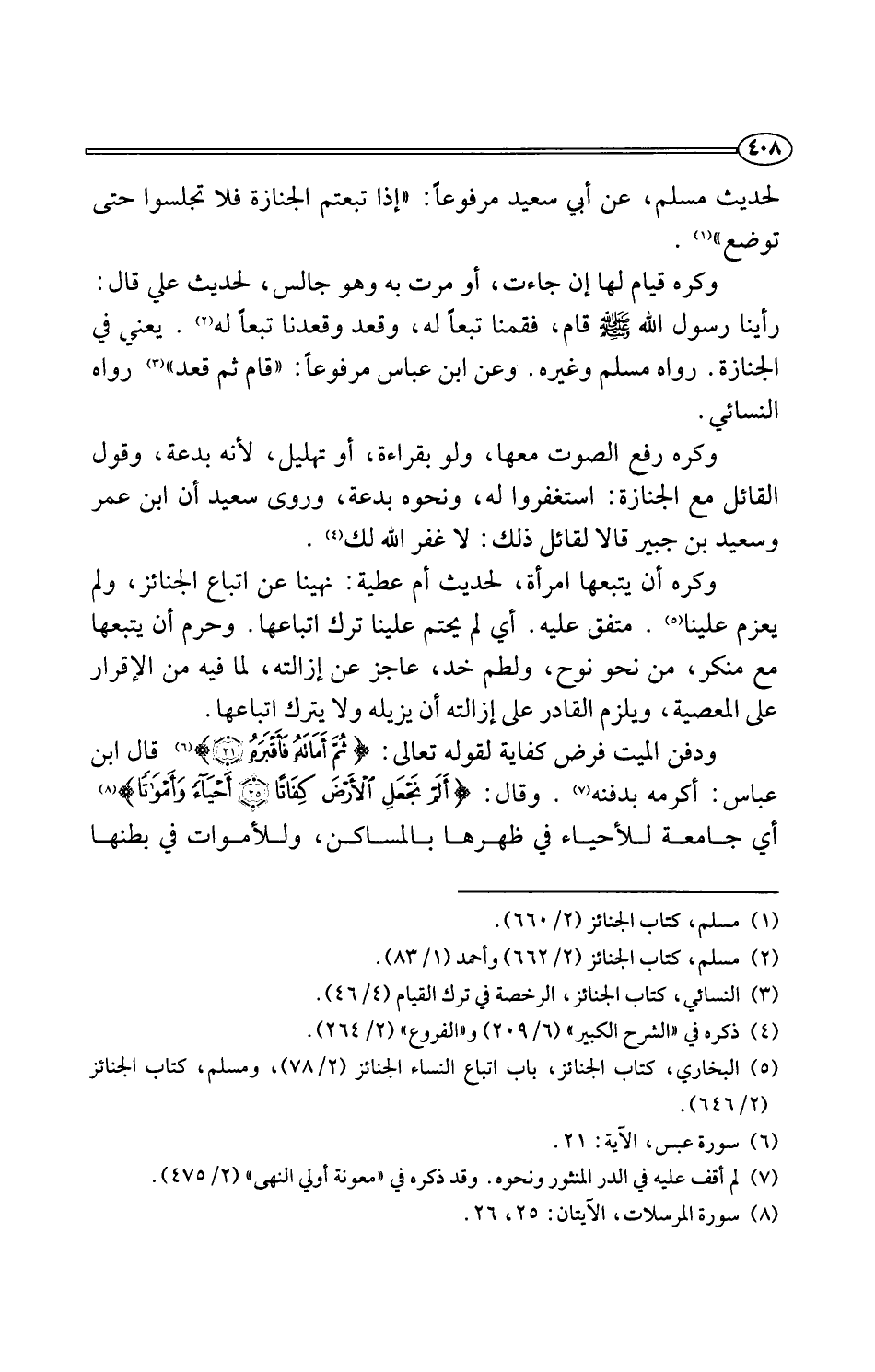 وكره قيام لها إن جاءت، أو مرت به وهو جالس، لحديث علي قال: رأينا رسول اللَّه -صلى اللَّه عليه وسلم- قام، فقمنا تبعًا له، وقعد وقعدنا تبعًا له (¬2). يعني في الجنازة. رواه مسلم وغيره. وعن ابن عباس مرفوعًا: "قام ثم قعد" (¬3) رواه النسائي.
