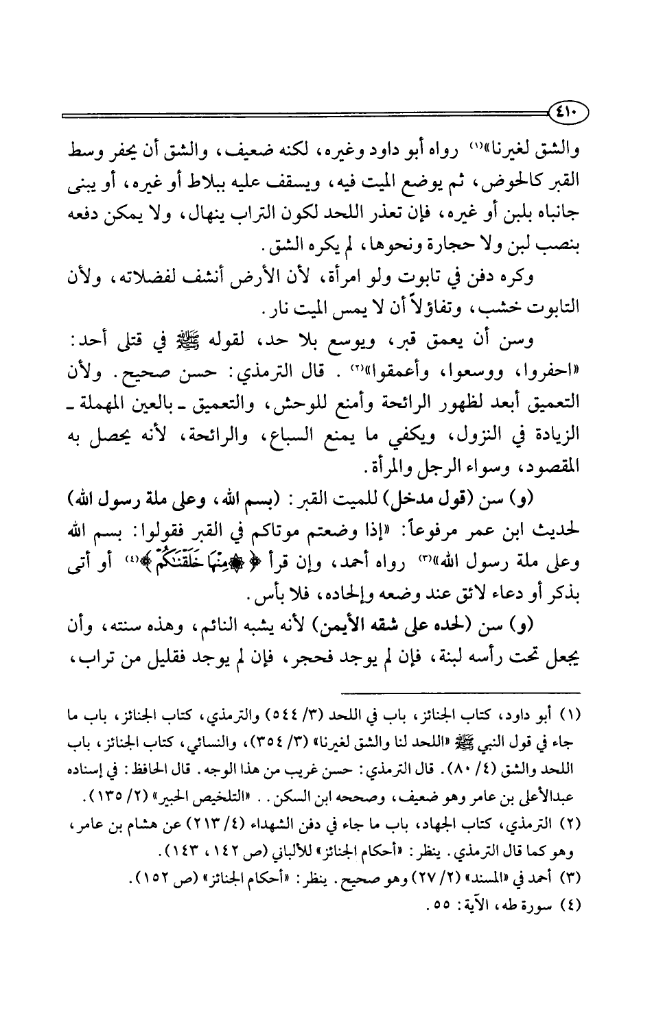 (¬1) أبو داود، كتاب الجنائز، باب في اللحد (3/ 544) والترمذي، كتاب الجنائز، باب ما جاء في قول النبي -صلى اللَّه عليه وسلم-"اللحد لنا والشق لغيرنا" (3/ 354)، والنسائي، كتاب الجنائز، باب اللحد والشق (4/ 80). قال الترمذي: حسن غريب من هذا الوجه. قال الحافظ: في إسناده عبد الأعلى بن عامر وهو ضعيف، وصححه ابن السكن. . "التلخيص الحبير" (2/ 135).