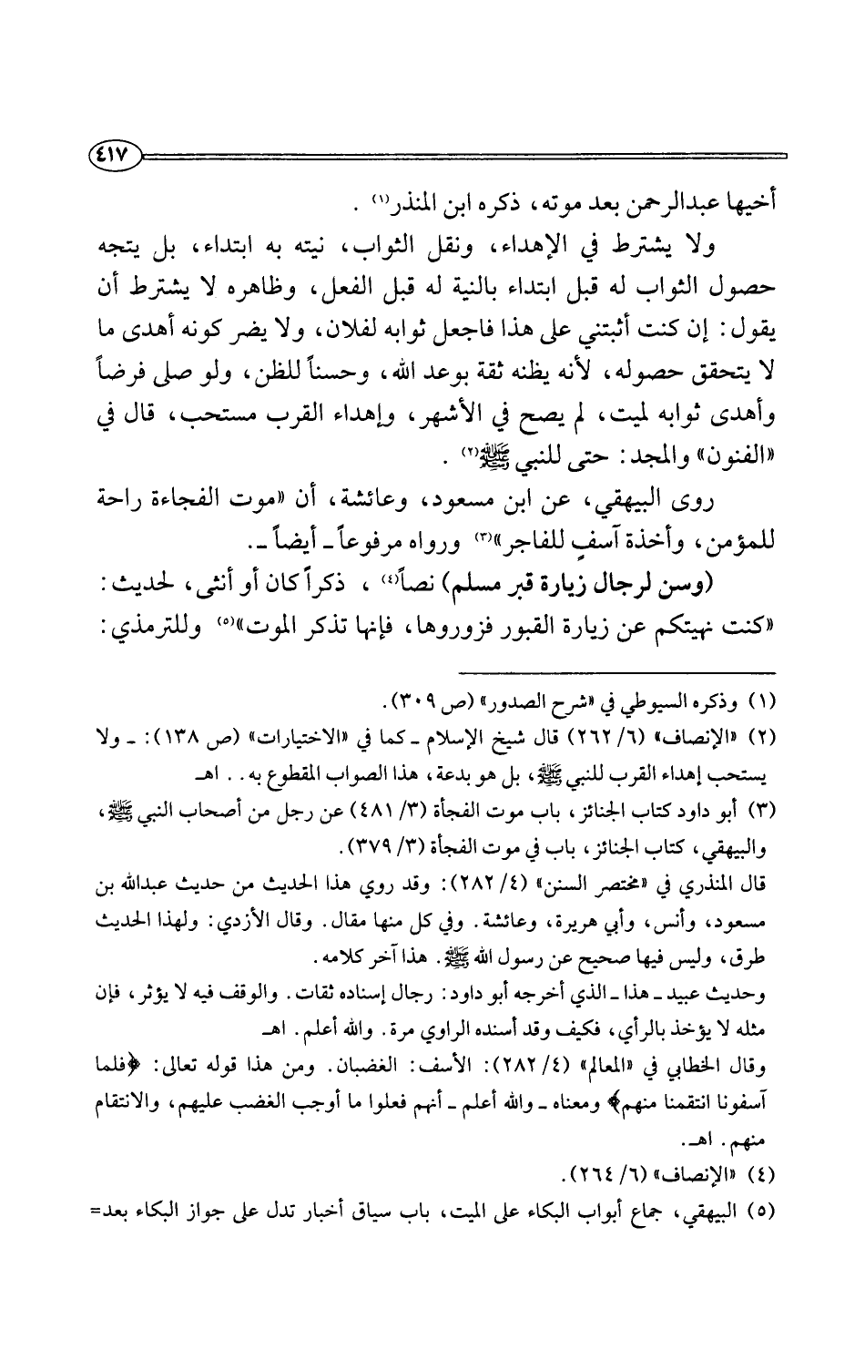 (¬2) "الإنصاف" (6/ 262) قال شيخ الإسلام -كما في "الاختيارات" (ص 138): - ولا يستحب إهداء القرب للنبي -صلى اللَّه عليه وسلم-، بل هو بدعة، هذا الصواب المقطوع به. . اهـ