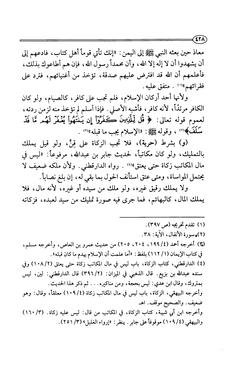 (¬4) الدارقطني، كتاب الزكاة، باب ليس في مال المكاتب زكاة حتى يعتق (2/ 108) وفي سنده عبد اللَّه بن بزيع. قال الذهبي في الميزان: (2/ 396) قال الدارقطني: لين، ليس بمتروك، وقال ابن عدي: ليس بحجة، ومن مناكيره. . . ثم ذكر هذا الحديث.