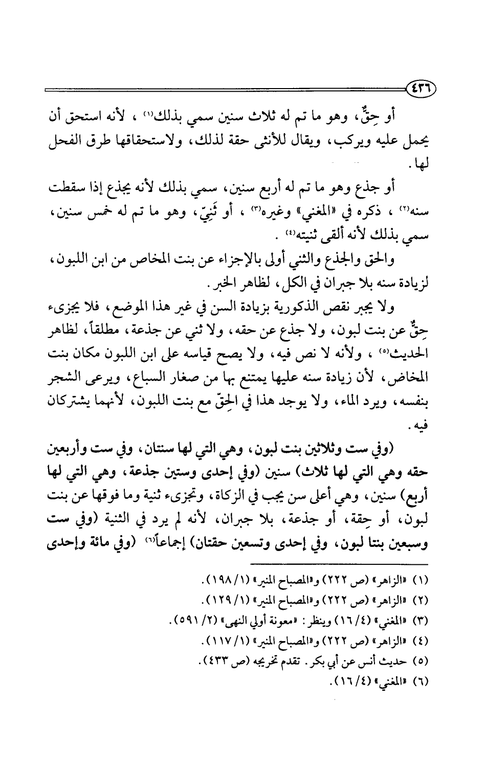 (وفي ست وثلاثين بنت لبون، وهي التي لها سنتان، وفي ست وأربعين حقه وهي التي لها ثلاث) سنين (وفي إحدى وستين جذعة، وهي التي لها أربع) سنين، وهي أعلى سن يجب في الزكاة، وتجزئ ثنية وما فوقها عن بنت لبون، أو حِقة، أو جذعة، بلا جبران، لأنه لم يرد في الثنية (وفي ست وسبعين بنتا لبون، وفي إحدى وتسعين حقتان) إجماعًا (¬6) (وفي مائة وإحدى