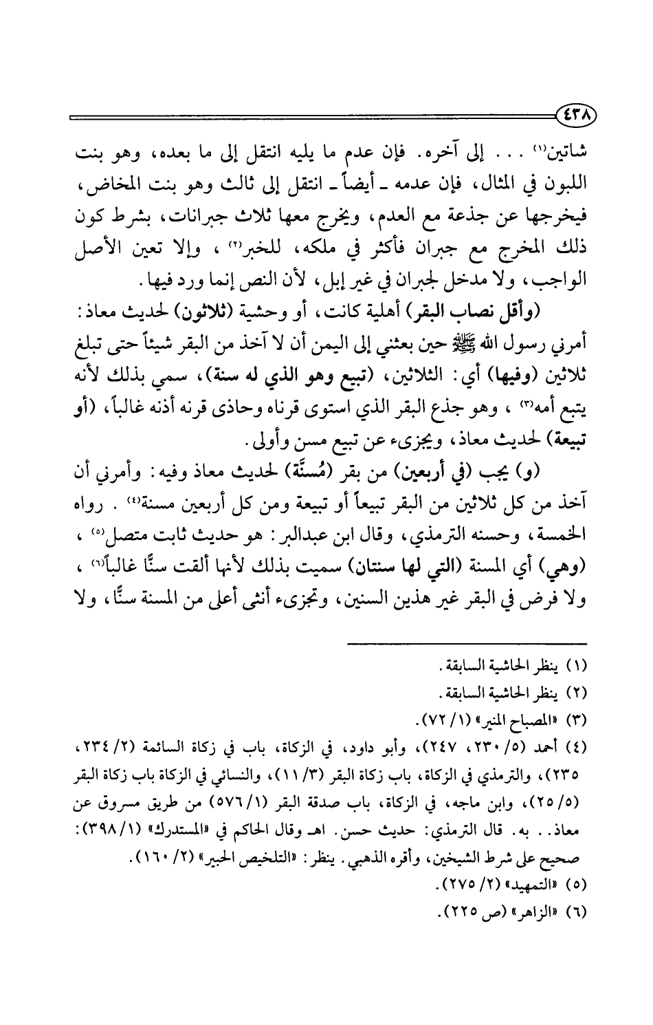 (و) يجب (في أربعين) من بقر (مُسنَّة) لحديث معاذ وفيه: وأمرني أن آخذ من كل ثلاثين من البقر تبيعًا أو تبيعة ومن كل أربعين مسنة (¬4). رواه الخمسة، وحسنه الترمذي، وقال ابن عبد البر: هو حديث ثابت متصل (¬5)، (وهي) أي المسنة (التي لها سنتان) سميت بذلك لأنها ألقت سنًّا غالبًا (¬6)، ولا فرض في البقر غير هذين السنين، وتجزئ أنثى أعلى من المسنة سنًّا، ولا