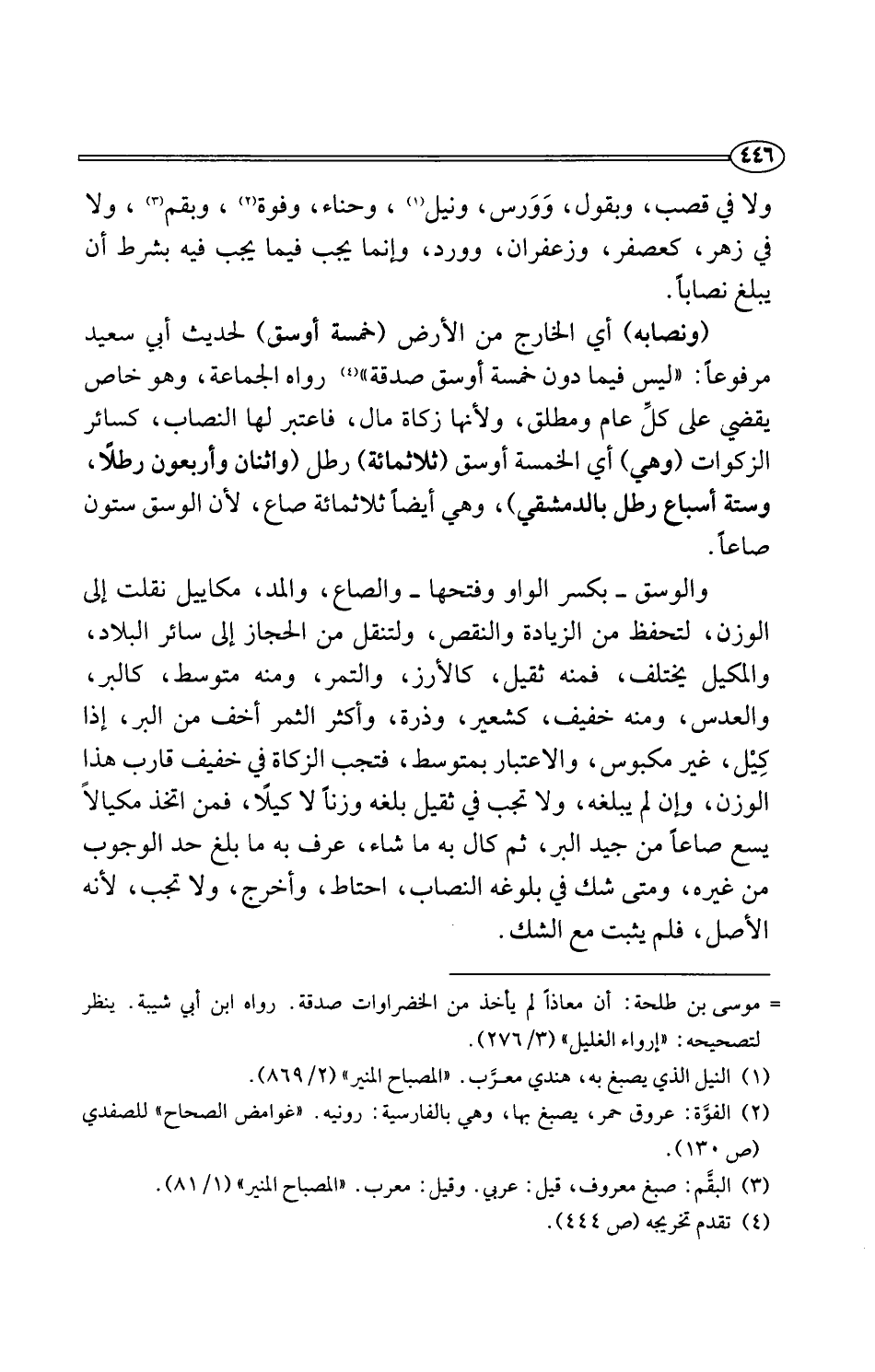 (ونصابه) أي الخارج من الأرض (خمسة أوسق) لحديث أبي سعيد مرفوعًا: "ليس فيما دون خمسة أوسق صدقة" (¬4) رواه الجماعة، وهو خاص يقضي على كلِّ عام ومطلق، ولأنها زكاة مال، فاعتبر لها النصاب، كسائر الزكوات (وهي) أي الخمسة أوسق (ثلاثمائة) رطل (واثنان وأربعون رطلًا، وستة أسباع رطل بالدمشقي)، وهي أيضًا ثلاثمائة صاع، لأن الوسق ستون صاعًا.
