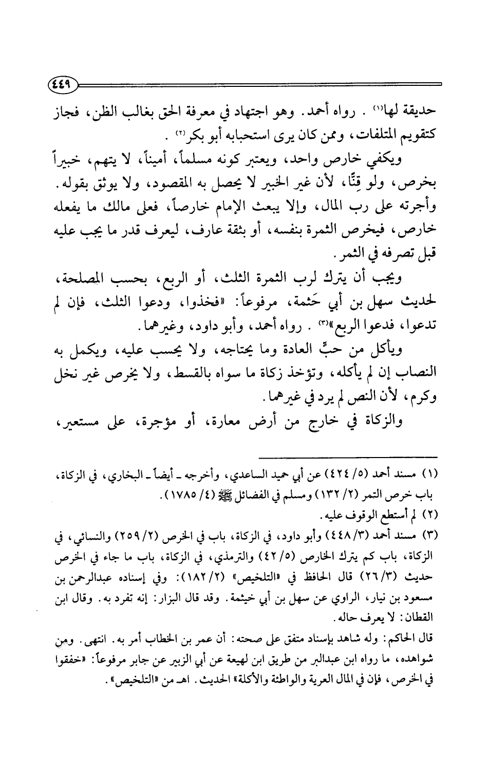 (¬3) مسند أحمد (3/ 448) وأبو داود، في الزكاة، باب في الخرص (2/ 259) والنسائي، في الزكاة، باب كم يترك الخارص (5/ 42) والترمذي، في الزكاة، باب ما جاء في الخرص حديث (3/ 26) قال الحافظ في "التلخيص" (2/ 182): وفي إسناده عبد الرحمن بن مسعود بن نيار، الراوي عن سهل بن أبي خيثمة. وقد قال البزار: إنه تفرد به. وقال ابن القطان: لا يعرف حاله.
