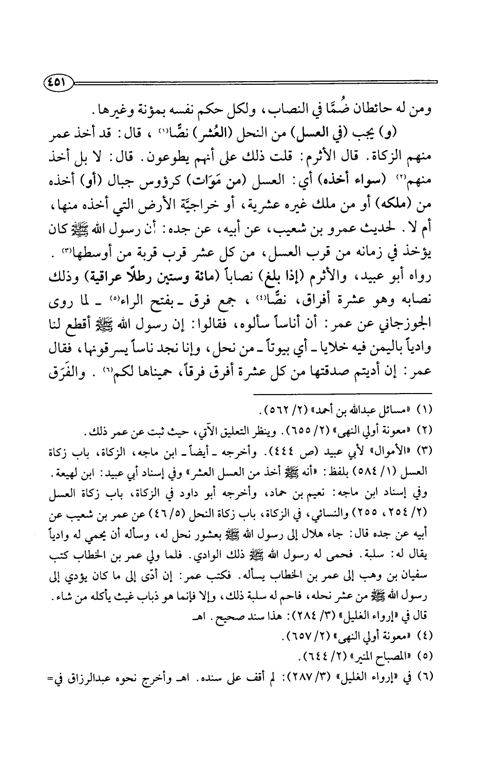 (¬3) "الأموال" لأبي عبيد (ص 444). وأخرجه -أيضًا- ابن ماجه، الزكاة، باب زكاة العسل (1/ 584) بلفظ: "أنه -صلى اللَّه عليه وسلم- أخذ من العسل العشر" وفي إسناد أبي عبيد: ابن لهيعة.