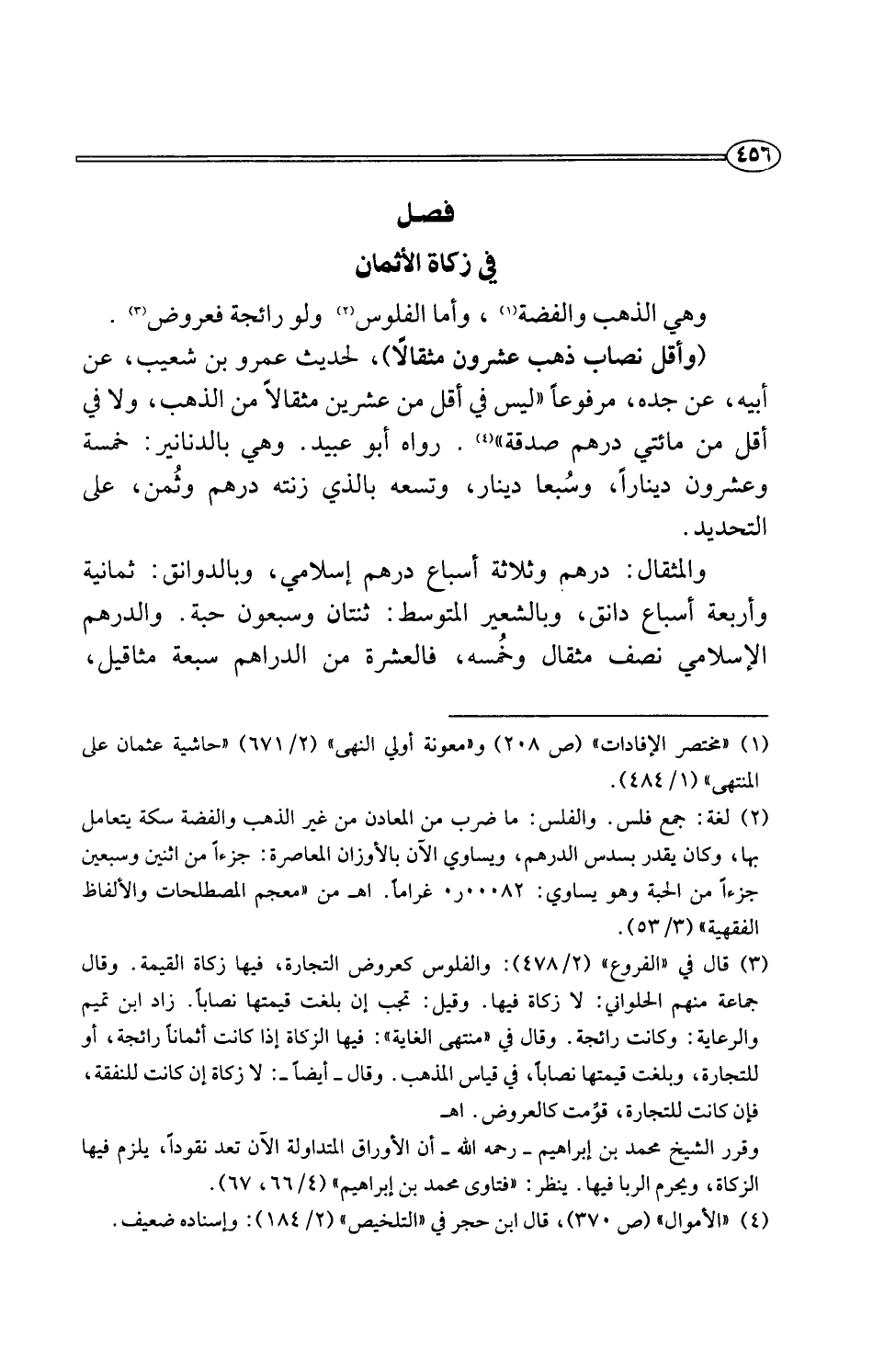 (¬3) قال في "الفروع" (2/ 478): والفلوس كعروض التجارة، فيها زكاة القيمة. وقال جماعة منهم الحلواني: لا زكاة فيها. وقيل: تجب إن بلغت قيمتها نصابًا. زاد ابن تميم والرعاية: وكانت رائجة. وقال في "منتهى الغاية": فيها الزكاة إذا كانت أثمانًا رائجة، أو للتجارة، وبلغت قيمتها نصابًا، في قياس المذهب. وقال -أيضًا-: لا زكاة إن كانت للنفقة، فإن كانت للتجارة، قوِّمت كالعروض. اهـ