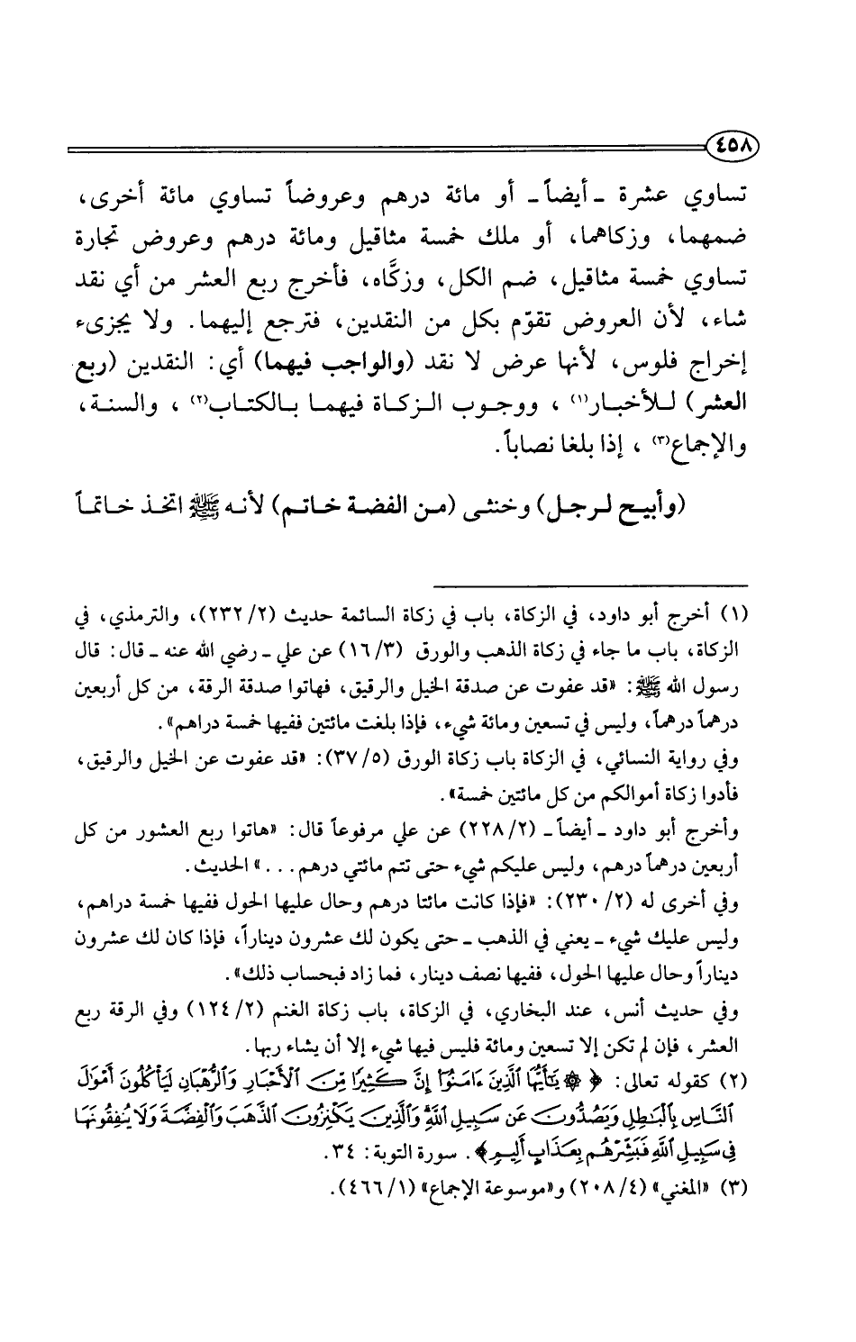 (¬1) أخرج أبو داود، في الزكاة، باب في زكاة السائمة حديث (2/ 232)، والترمذي، في الزكاة، باب ما جاء في زكاة الذهب والورق (3/ 16) عن علي -رضي اللَّه عنه- قال: قال رسول اللَّه -صلى اللَّه عليه وسلم-: "قد عفوت عن صدقة الخيل والرقيق، فهاتوا صدقة الرقة، من كل أربعين درهمًا درهمًا، وليس في تسعين ومائة شيء، فإذا بلغت مائتين ففيها خمسة دراهم".