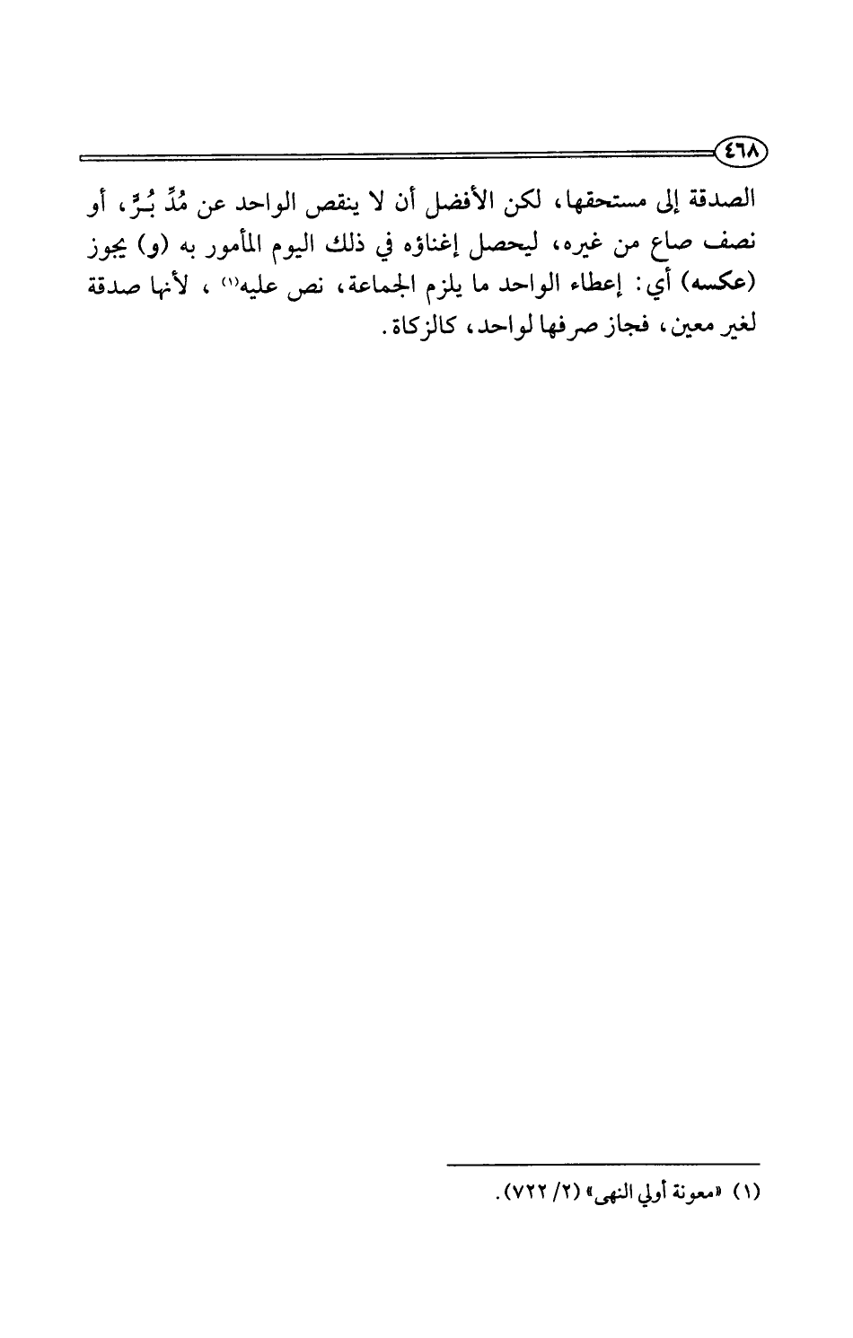 الصدقة إلى مستحقها، لكن الأفضل أن لا ينقص الواحد عن مُدِّ بُرٍّ، أو نصف صاع من غيره، ليحصل إغناؤه في ذلك اليوم المأمور به (و) يجوز (عكسه) أي: إعطاء الواحد ما يلزم الجماعة، نص عليه (¬1)، لأنها صدقة لغير معين، فجاز صرفها لواحد، كالزكاة.