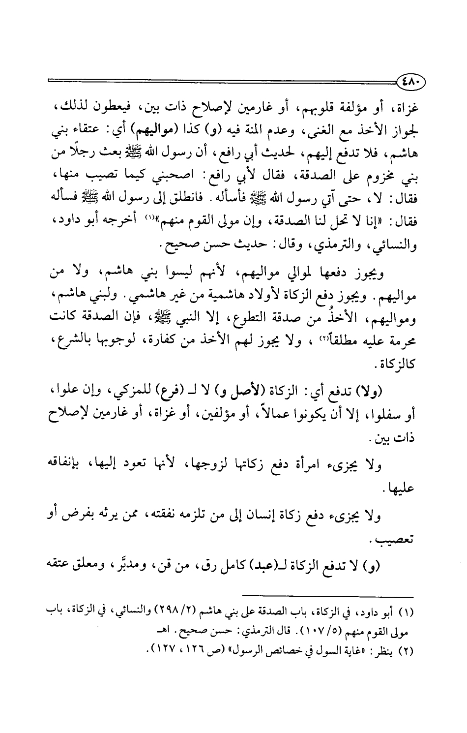 غزاة، أو مؤلفة قلوبهم، أو غارمين لإصلاح ذات بين، فيعطون لذلك، لجواز الأخذ مع الغنى، وعدم المنة فيه (و) كذا (مواليهم) أي: عتقاء بني هاشم، فلا تدفع إليهم، لحديث أبي رافع، أن رسول اللَّه -صلى اللَّه عليه وسلم- بعث رجلًا من بني مخزوم على الصدقة، فقال لأبي رافع: اصحبني كيما تصيب منها، فقال: لا، حتى آتي رسول اللَّه -صلى اللَّه عليه وسلم- فأسأله. فانطلق إلى رسول اللَّه -صلى اللَّه عليه وسلم- فسأله فقال: "إنا لا تحل لنا الصدقة، وإن مولى القوم منهم" (¬1) أخرجه أبو داود، والنسائي، والترمذي، وقال: حديث حسن صحيح.