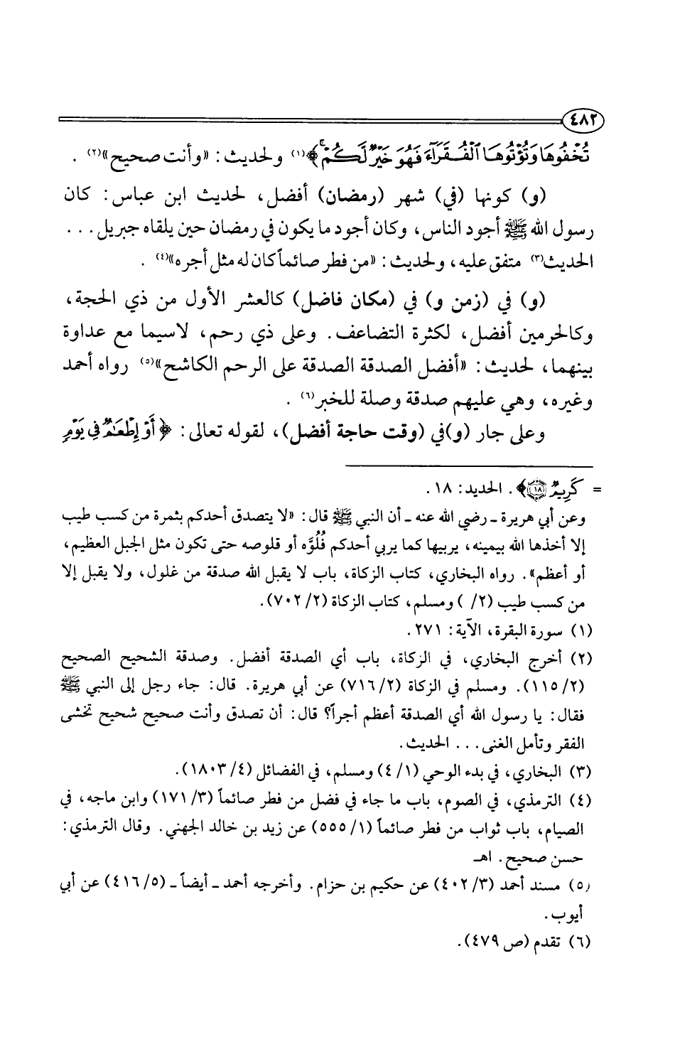 (¬2) أخرج البخاري، في الزكاة، باب أي الصدقة أفضل. وصدقة الشحيح الصحيح (2/ 115). ومسلم في الزكاة (2/ 716) عن أبي هريرة. قال: جاء رجل إلى النبي -صلى اللَّه عليه وسلم- فقال: يا رسول اللَّه أي الصدقة أعظم أجرًا؟ قال: أن تصدق وأنت صحيح شحيح تخشى الفقر وتأمل الغنى. . . الحديث.