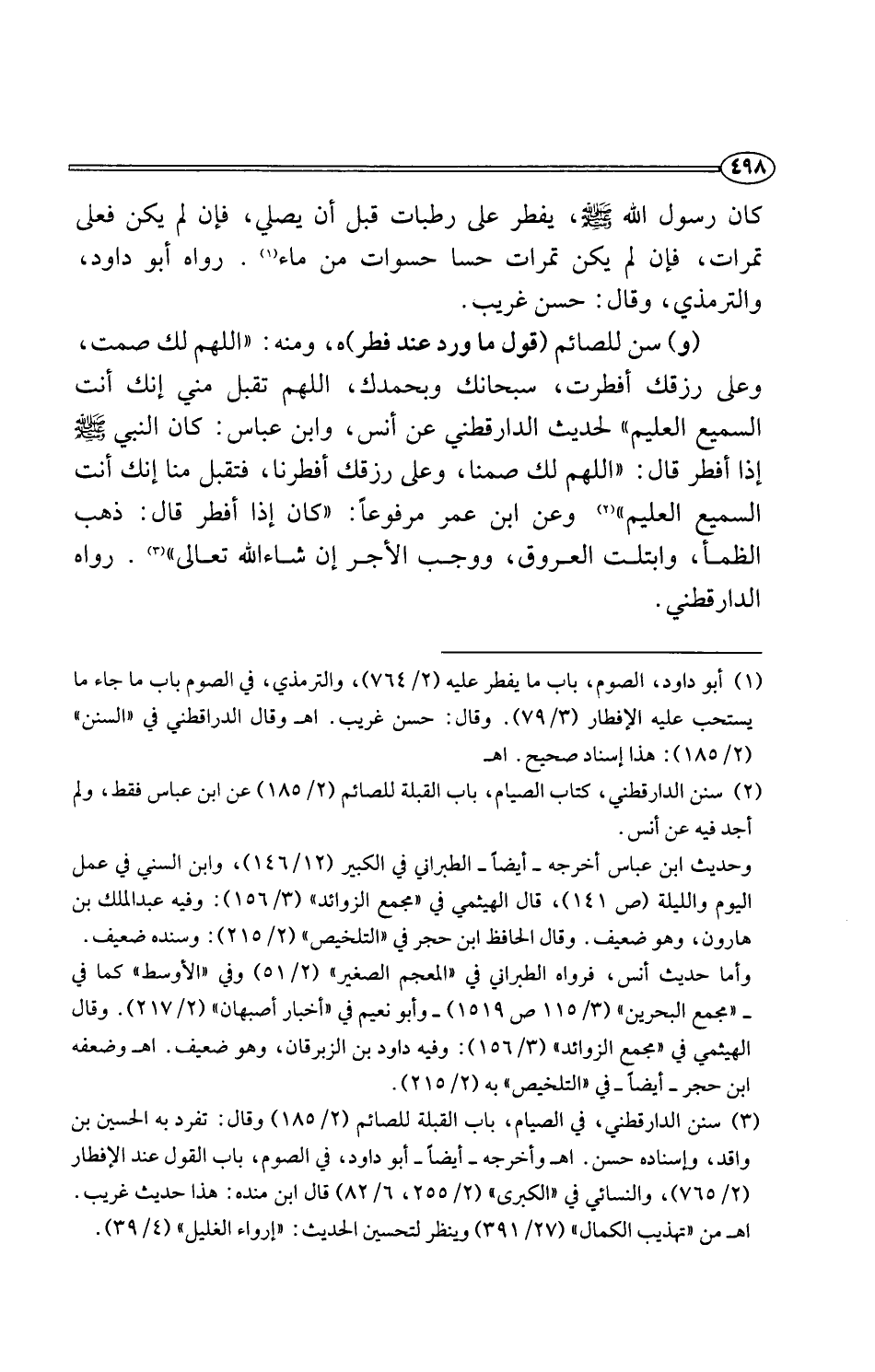 (¬1) أبو داود، الصوم، باب ما يفطر عليه (2/ 764)، والترمذي، في الصوم باب ما جاء ما يستحب عليه الإفطار (3/ 79). وقال: حسن غريب. اهـ وقال الدراقطني في "السنن" (2/ 185): هذا إسناد صحيح. اهـ