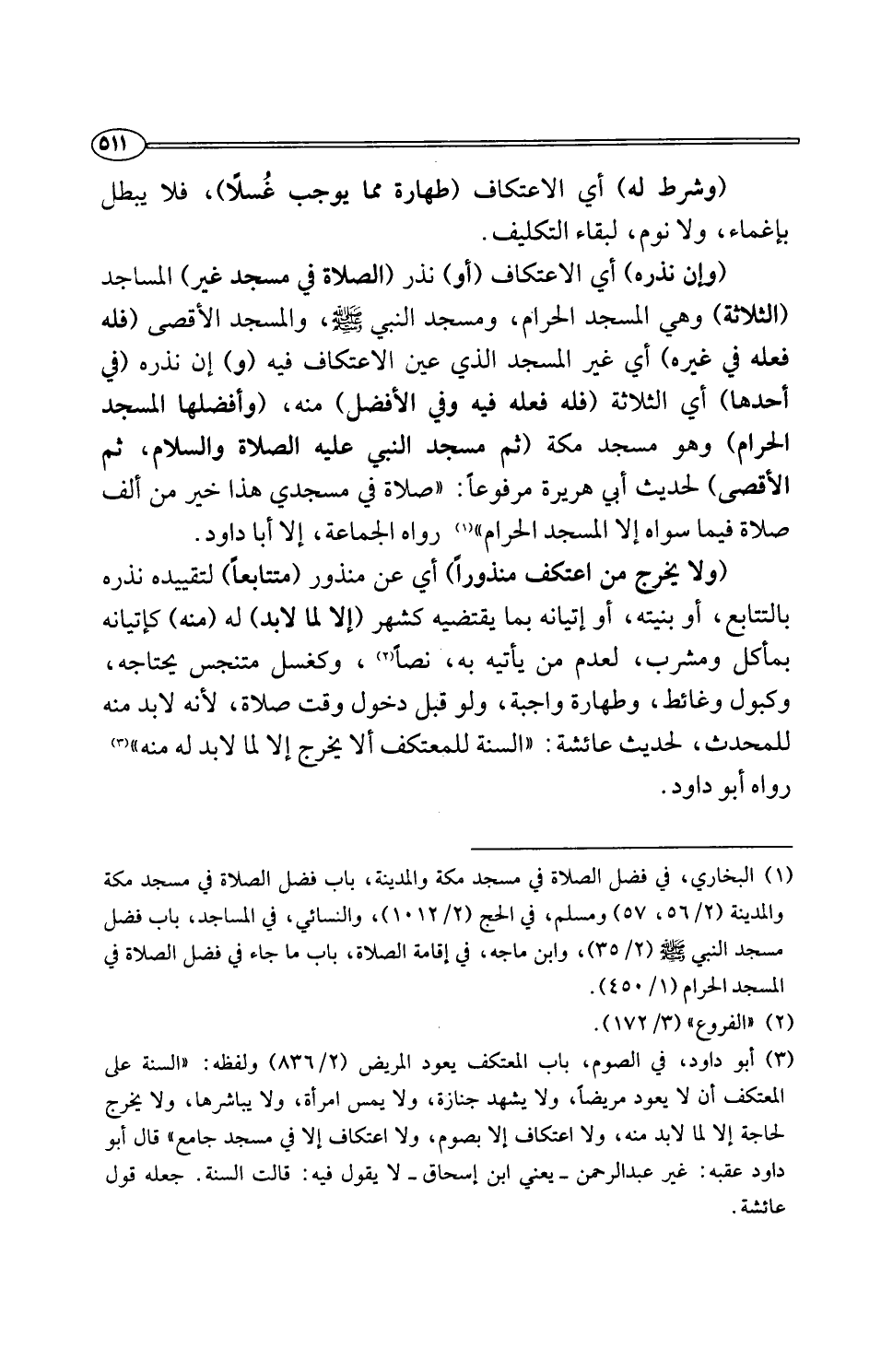(¬3) أبو داود، في الصوم، باب المعتكف يعود المريض (2/ 836) ولفظه: "السنة على المعتكف أن لا يعود مريضًا، ولا يشهد جنازة، ولا يمس امرأة، ولا يباشرها، ولا يخرج لحاجة إلا لما لابد منه، ولا اعتكاف إلا بصوم، ولا اعتكاف إلا في مسجد جامع" قال أبو داود عقبه: غير عبد الرحمن -يعني ابن إسحاق- لا يقول فيه: قالت السنة. جعله قول عائشة.