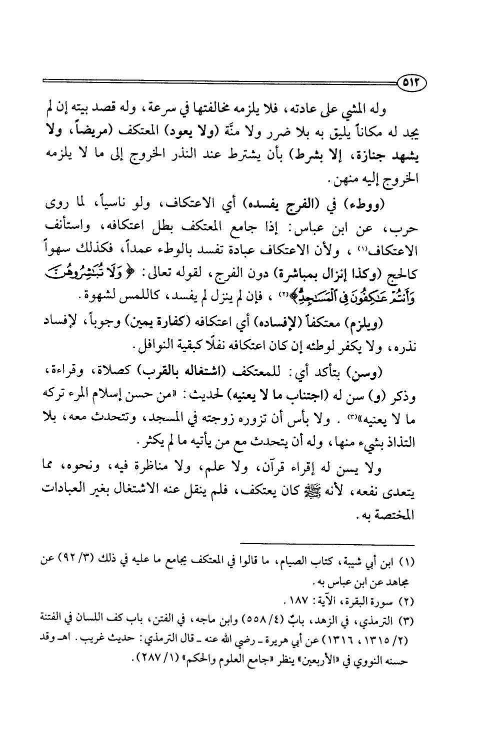 (وسن) بتأكد أي: للمعتكف (اشتغاله بالقرب) كصلاة، وقراءة، وذكر (و) سن له (اجتناب ما لا يعنبه) لحديث: "من حسن إسلام المرء تركه ما لا يعنيه" (¬3). ولا بأس أن تزوره زوجته في المسجد، وتتحدث معه، بلا التذاذ بشيء منها، وله أن يتحدث مع من يأتيه ما لم يكثر.