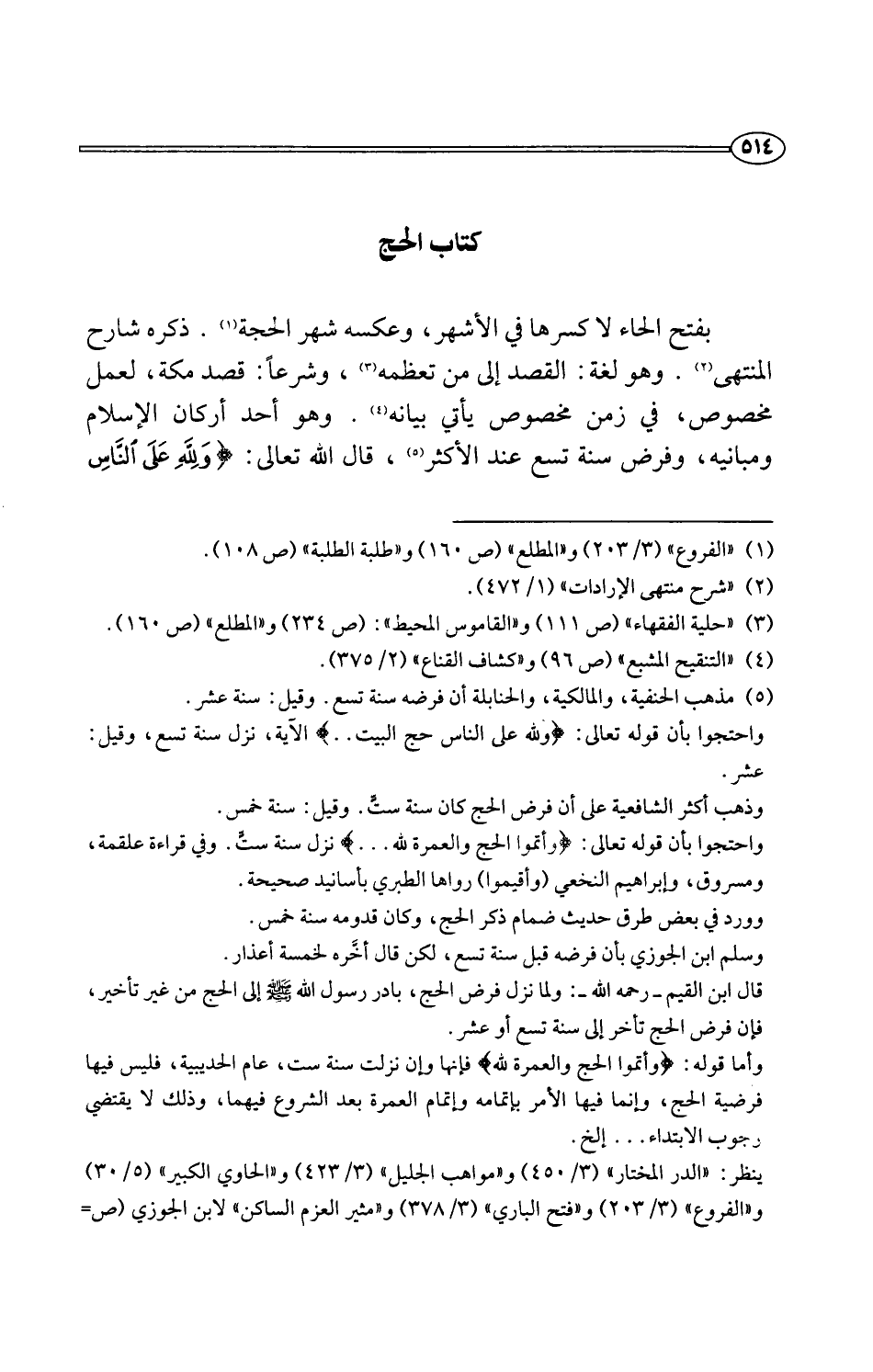 بفتح الحاء لا كسرها في الأشهر، وعكسه شهر الحجة (¬1). ذكره شارح المنتهى (¬2). وهو لغة: القصد إلى من تعظمه (¬3)، وشرعًا: قصد مكة، لعمل مخصوص، في زمن مخصوص يأتي بيانه (¬4). وهو أحد أركان الإسلام ومبانيه، وفرض سنة تسع عند الأكثر (¬5)، قال اللَّه تعالى: {وَلِلَّهِ عَلَى النَّاسِ