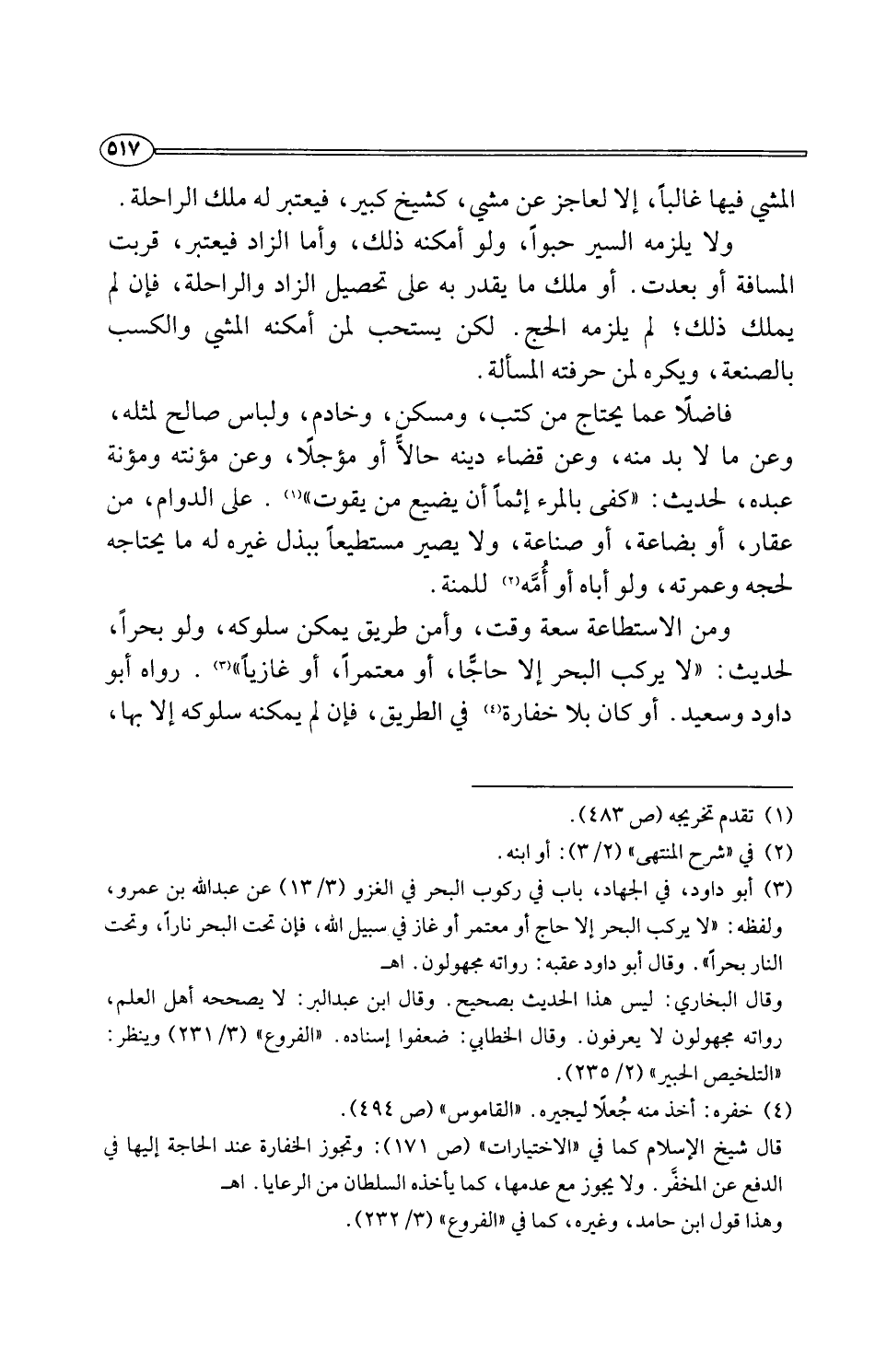 ومن الاستطاعة سعة وقت، وأمن طريق يمكن سلوكه، ولو بحرًا، لحديث: "لا يركب البحر إلا حاجًّا، أو معتمرًا، أو غازيًا" (¬3). رواه أبو داود وسعيد. أو كان بلا خفارة (¬4) في الطريق، فإن لم يمكنه سلوكه إلا بها،