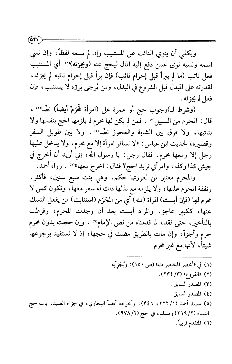 (وشرط لـ) وجوب حج أو عمرة على (امرأة مَحْرَم أيضًا) نصًّا (¬2)، قال: المحرم من السبيل (¬3). فمن لم يكن لها محرم لم يلزمها الحج بنفسها ولا بنائبها، ولا فرق بين الشابة والعجوز نصًّا (¬4)، ولا بين طويل السفر وقصيره، لحديث ابن عباس: "لا تسافر امرأة إلا مع محرم، ولا يدخل عليها رجل إلا ومعها محرم. فقال رجل: يا رسول اللَّه، إني أريد أن أخرج في جيش كذا وكذا، وامرأتي تريد الحج؟ فقال: أخرج معها" (¬5). رواه أحمد.
