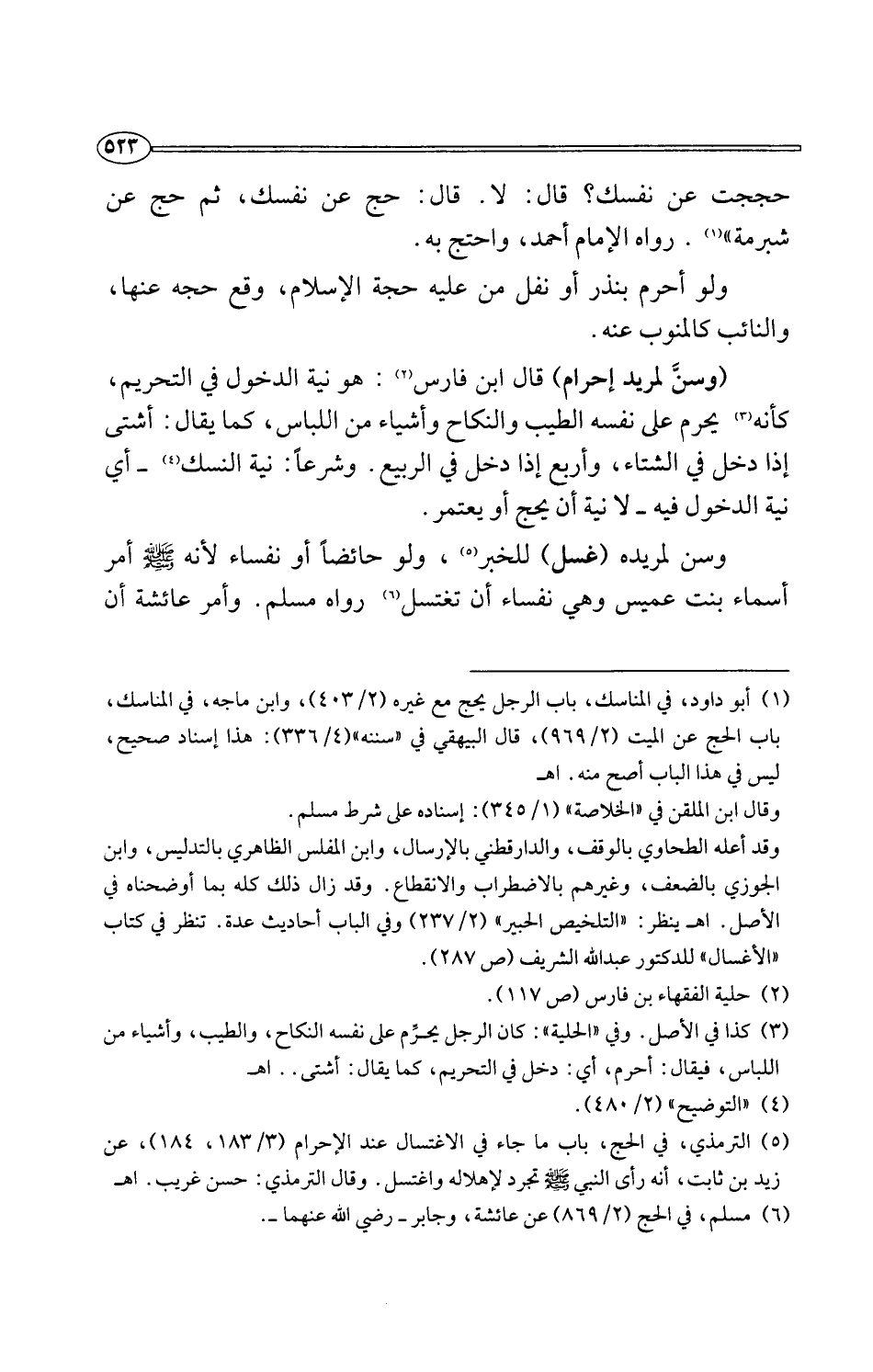 (وسنَّ لمريد إحرام) قال ابن فارس (¬2): هو نية الدخول في التحريم، كأنه (¬3) يحرم على نفسه الطيب والنكاح وأشياء من اللباس، كما يقال: أشتى إذا دخل في الشتاء، وأربع إذا دخل في الربيع. وشرعًا: نية النسك (¬4) -أي نية الدخول فيه- لا نية أن يحج أو يعتمر.