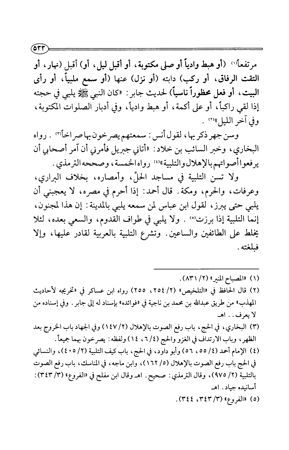 مرتفعًا (¬1) (أو هبط واديًا أو صلى مكتوبة، أو أقبل ليل، أو) أقبل (نهار، أو التقت الرفاق، أو ركب) دابته (أو نزل) عنها (أو سمع ملبيًا، أو رأى البيت، أو فعل محظورًا ناسيًا) لحديث جابر: "كان النبي -صلى اللَّه عليه وسلم- يلبي في حجته إذا لقي راكبًا، أو على أكمة، أو هبط واديًا، وفي أدبار الصلوات المكتوبة، وفي آخر الليل" (¬2).