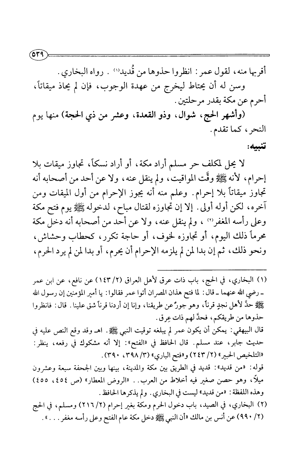 (¬1) البخاري، في الحج، باب ذات عرق لأهل العراق (2/ 143) عن نافع، عن ابن عمر - رضي اللَّه عنهما- قال: لما فتح هذان المصران أتوا عمر فقالوا: يا أمير المؤمنين إن رسول اللَّه -صلى اللَّه عليه وسلم- حدَّ لأهل نجدٍ قرنًا، وهو جورٌ عن طريقنا، وإنا إن أردنا قرنًا شق علينا. قال: فانظروا حذوها من طريقكم، فحدَّ لهم ذات عِرق.