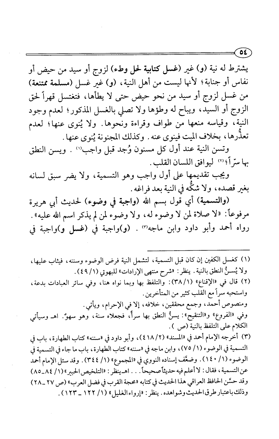 (¬3) أخرجه الإمام أحمد في "المسند" (2/ 418)، وأبو داود في "سننه" كتاب الطهارة، باب في التسمية في الوضوء (1/ 75)، وابن ماجه في "سننه" كتاب الطهارة، باب ما جاء في التسمية في الوضوء (1/ 140). وضعف إسناده النووي في "المجموع" (1/ 344). وقد سئل الإمام أحمد عن التسمية، فقال: لا أعلم فيه حديثًا صحيحًا. . . اهـ ينظر: "التلخيص الحبير" (1/ 84 - 85) وقد حسَّن الحافظ العراقي هذا الحديث في كتابه "محجة القرب في فضل العرب" (ص 27 - 28) وذلك باعتبار طرق الحديث وشواهده. ينظر: "إرواء الغليل" (1/ 122 - 123).