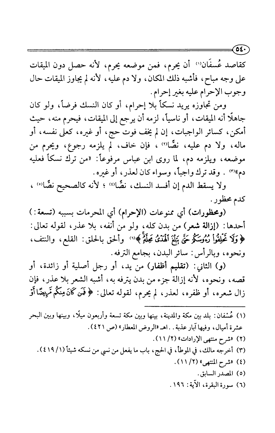 (ومحظورات) أي ممنوعات (الإحرام) أي المحرمات بسببه (تسعة: ) أحدها: (إزالة شعر) من بدن كله، ولو من أنفه، بلا عذر، لقوله تعالى: {وَلَا تَحْلِقُوا رُءُوسَكُمْ حَتَّى يَبْلُغَ الْهَدْيُ مَحِلَّهُ} (¬6) وألحق بالحلق: القلع، والنتف، ونحوه، وبالرأس: سائر البدن، بجامع الترفه.