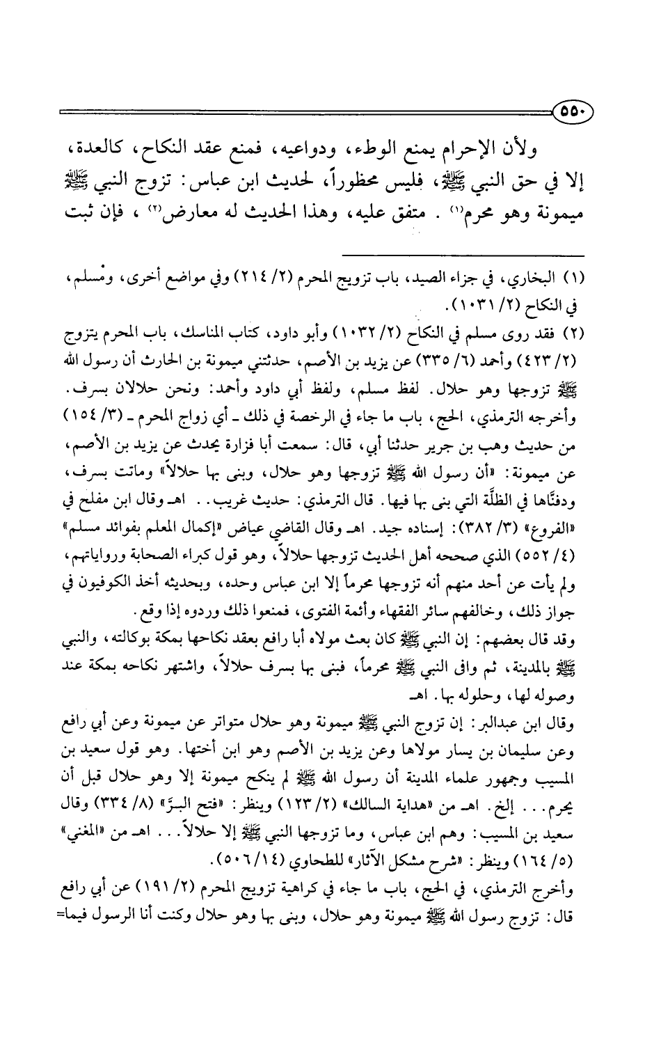 (¬2) فقد روى مسلم في النكاح (2/ 1032) وأبو داود، كتاب المناسك، باب المحرم يتزوج (2/ 423) وأحمد (6/ 335) عن يزيد بن الأصم، حدثتني ميمونة بن الحارث أن رسول اللَّه -صلى اللَّه عليه وسلم- تزوجها وهو حلال. لفظ مسلم، ولفظ أبي داود وأحمد: ونحن حلالان بسرف. وأخرجه الترمذي، الحج، باب ما جاء في الرخصة في ذلك -أي زواج المحرم- (3/ 154) من حديث وهب بن جرير حدثنا أبي، قال: سمعت أبا فزارة يحدث عن يزيد بن الأصم، عن ميمونة: "أن رسول اللَّه -صلى اللَّه عليه وسلم- تزوجها وهو حلال، وبنى بها حلالًا" وماتت بسرف، ودفنَّاها في الظلَّة التي بنى بها فيها. قال الترمذي: حديث غريب. . اهـ وقال ابن مفلح في "الفروع" (3/ 382): إسناده جيد. اهـ وقال القاضي عياض "إكمال المعلم بفوائد مسلم" (4/ 552) الذي صححه أهل الحديث تزوجها حلالًا، وهو قول كبراء الصحابة ورواياتهم، ولم يأت عن أحد منهم أنه تزوجها محرمًا إلا ابن عباس وحده، وبحديثه أخذ الكوفيون في جواز ذلك، وخالفهم سائر الفقهاء وأئمة الفتوى، فمنعوا ذلك وردوه إذا وقع.