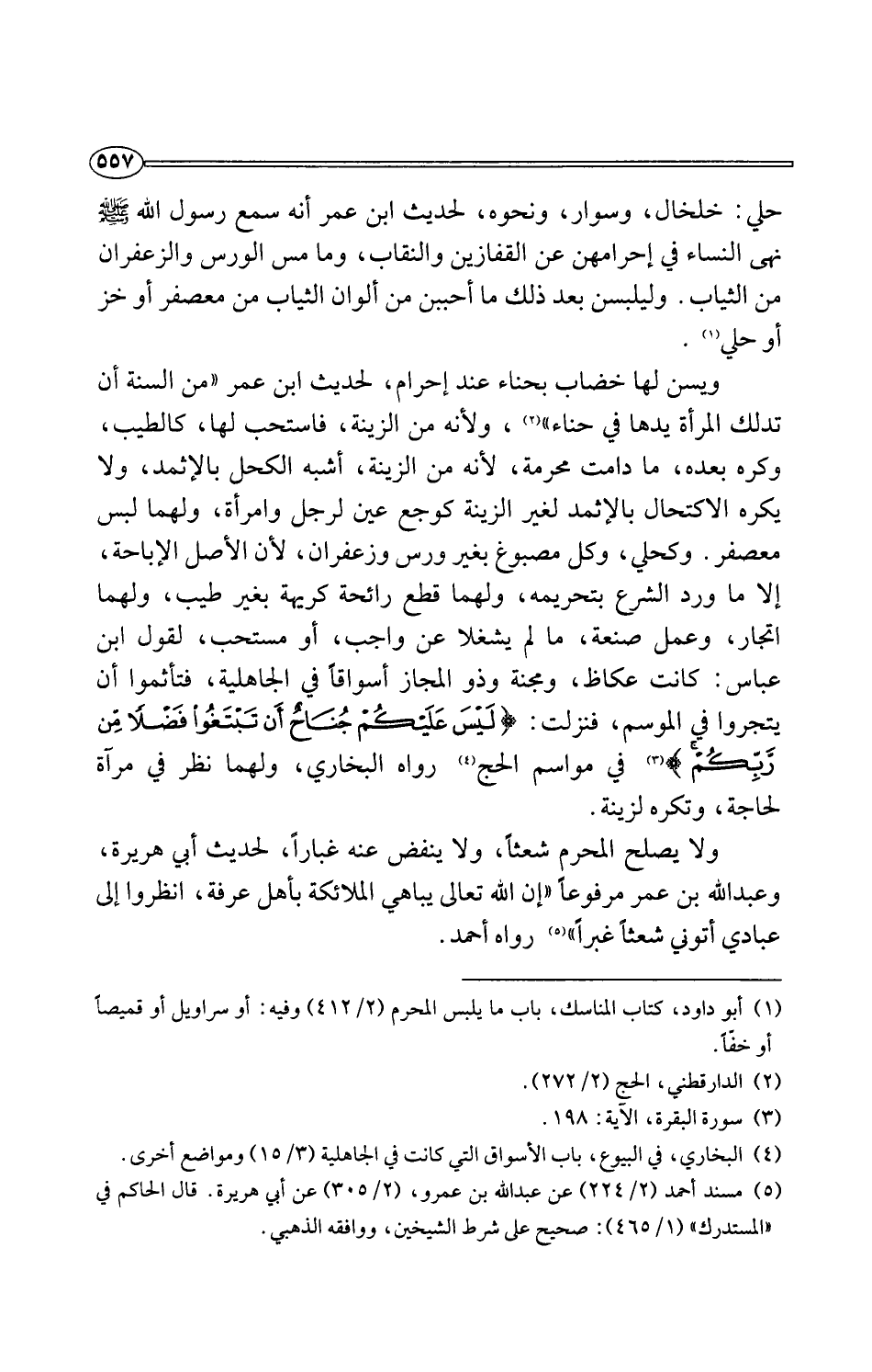 ويسن لها خضاب بحناء عند إحرام، لحديث ابن عمر "من السنة أن تدلك المرأة يدها في حناء" (¬2)، ولأنه من الزينة، فاستحب لها، كالطيب، وكره بعده، ما دامت محرمة، لأنه من الزينة، أشبه الكحل بالإثمد، ولا يكره الاكتحال بالإثمد لغير الزينة كوجع عين لرجل وامرأة، ولهما لبس معصفر. وكحلي، وكل مصبوغ بغير ورس وزعفران، لأن الأصل الإباحة، إلا ما ورد الشرع بتحريمه، ولهما قطع رائحة كريهة بغير طيب، ولهما اتجار، وعمل صنعة، ما لم يشغلا عن واجب، أو مستحب، لقول ابن عباس: كانت عكاظ، ومجنة وذو المجاز أسواقًا في الجاهلية، فتأثموا أن يتجروا في الموسم، فنزلت: {لَيْسَ عَلَيْكُمْ جُنَاحٌ أَنْ تَبْتَغُوا فَضْلًا مِنْ رَبِّكُمْ} (¬3) في مواسم الحج (¬4) رواه البخاري، ولهما نظر في مرآة لحاجة، وتكره لزينة.