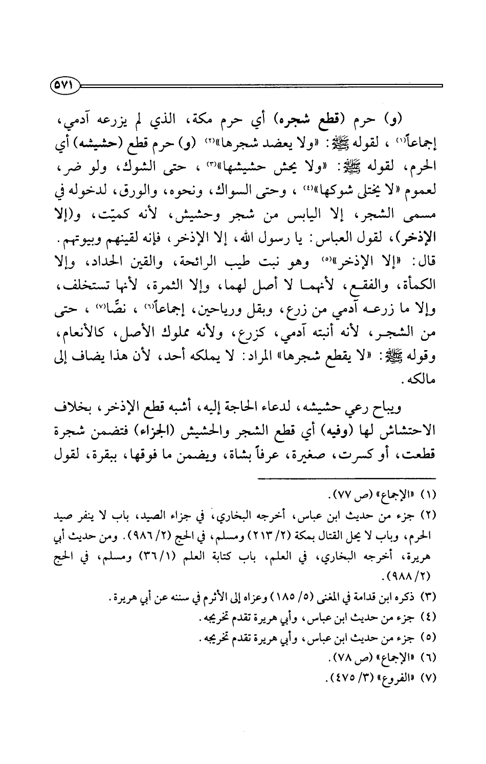 (و) حرم (قطع شجره) أي حرم مكة، الذي لم يزرعه آدمي، إجماعًا (¬1)، لقوله -صلى اللَّه عليه وسلم-: "ولا يعضد شجرها" (¬2) (و) حرم قطع (حشيشه) أي الحرم، لقوله -صلى اللَّه عليه وسلم-: "ولا يحش حشيشها" (¬3)، حتى الشوك، ولو ضر، لعموم "لا يختلى شوكها" (¬4)، وحتى السواك، ونحوه، والورق، لدخوله في مسمى الشجر، إلا اليابس ممن شجر وحشيش، لأنه كميت، و (إلا الإذخر)، لقول العباس: يا رسول اللَّه، إلا الإذخر، فإنه لقينهم وبيوتهم. قال: "إلا الإذخر" (¬5) وهو نبت طيب الرائحة، والقين الحداد، وإلا الكمأة، والفقع، لأنهما لا أصل لهما، وإلا الثمرة، لأنها تستخلف، وإلا ما زرعه آدمي من زرع، وبقل ورياحين، إجماعًا (¬6)، نصًّا (¬7)، حتى من الشجر، لأنه أنبته آدمي، كزرع، ولأنه مملوك الأصل، كالأنعام، وقوله -صلى اللَّه عليه وسلم-: "لا يقطع شجرها" المراد: لا يملكه أحد، لأن هذا يضاف إلى مالكه.