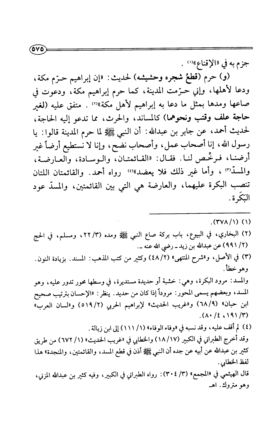 (و) حرم (قطعُ شجره وحشيشه) لحديث: "إن إبراهيم حرّم مكة، ودعا لأهلها، وإني حرّمت المدينة، كما حرم إبراهيم مكة، ودعوت في صاعها ومدها بمثل ما دعا به إبراهيم لأهل مكة" (¬2). متفق عليه (لغير حاجة علف وفتب ونحوهما) كالمساند، والحرث، مما تدعو إليه الحاجة، لحديث أحمد، عن جابر بن عبد اللَّه: أن النبي -صلى اللَّه عليه وسلم- لما حرم المدينة قالوا: يا رسول اللَّه، إنا أصحاب عمل، وأصحاب نضح، وإنا لا نستطيع أرضًا غير أرضنا، فرخِّص لنا. فقال: "القائمتان، والوسادة، والعارضة، والمسدّ (¬3)، وأما غير ذلك فلا يعضد" (¬4) رواه أحمد. والقائمتان اللتان تنصب البكرة عليهما، والعارضة هي التي بين القائمتين، والمسدّ عود البَكَرة.