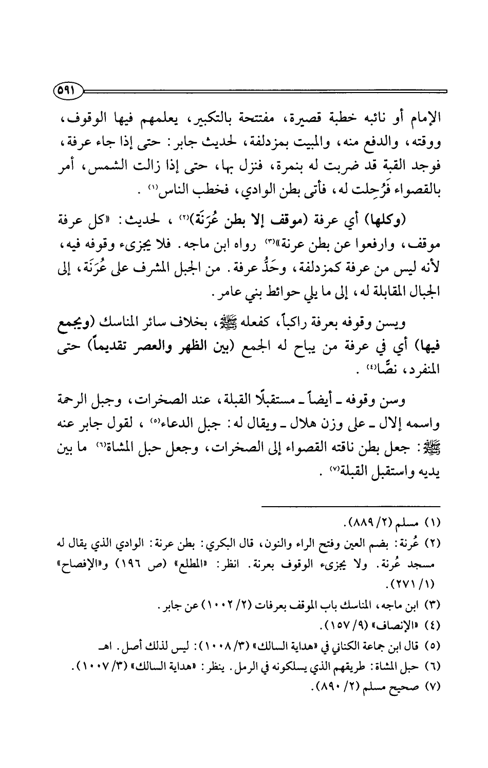 (¬2) عُرنة: بضم العين وفتح الراء والنون، قال البكري: بطن عرنة: الوادي الذي يقال له مسجد عُرنة. ولا يجزئ الوقوف بعرنة. انظر: "المطلع" (ص 196) و"الإفصاح" (1/ 271).