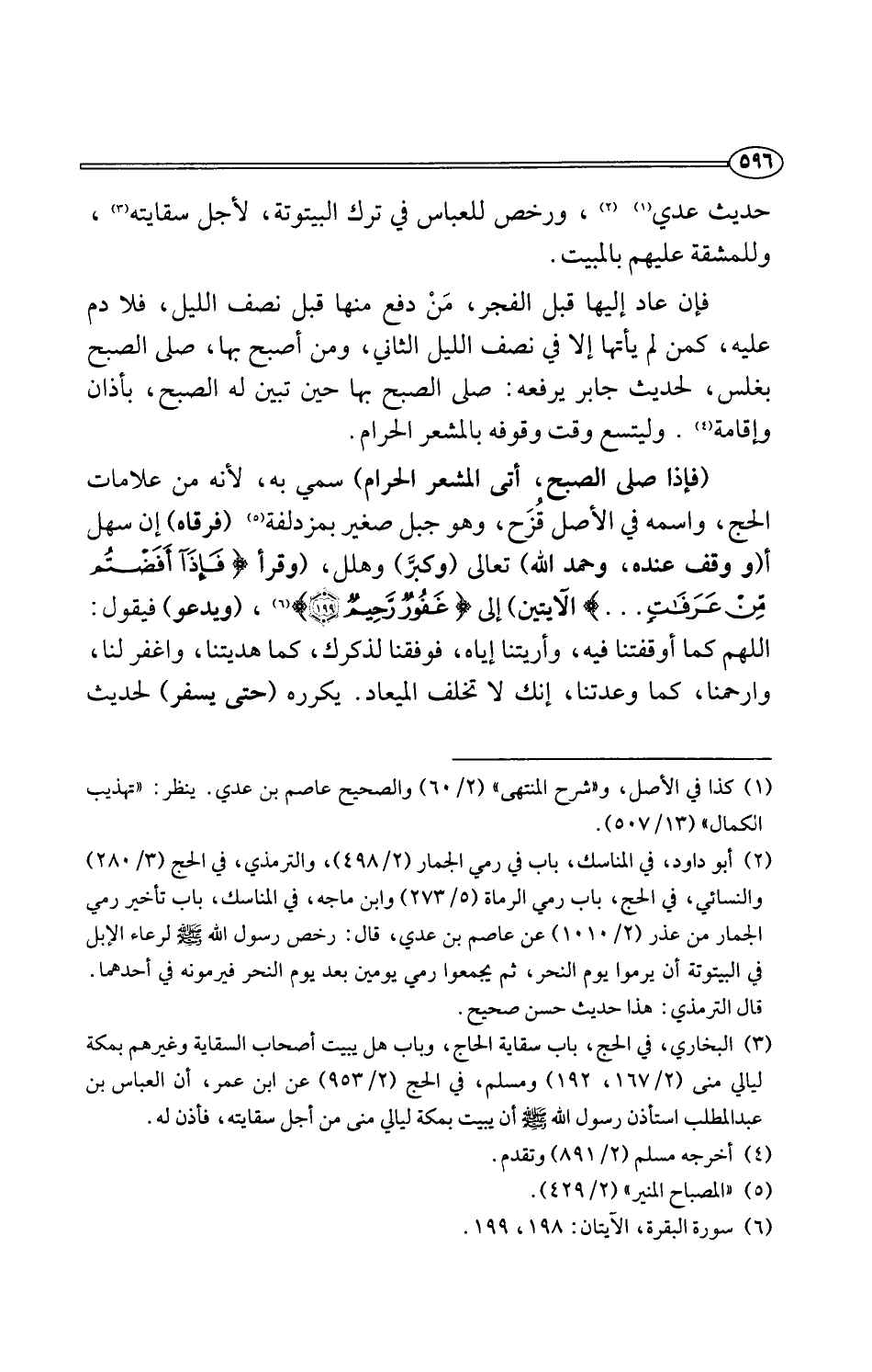 حديث عدي (¬1) (¬2)، ورخص للعباس في ترك البيتوتة، لأجل سقايته (¬3)، وللمشقة عليهم بالمبيت.