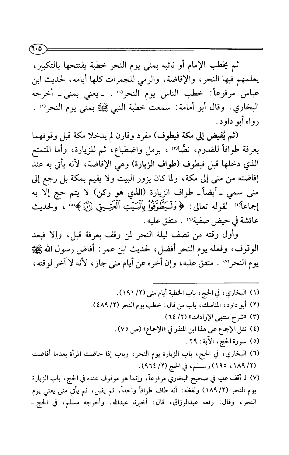 (¬6) البخاري، في الحج، باب الزيارة يوم النحر، وباب إذا حاضت المرأة بعدما أفاضت (2/ 189، 195) ومسلم، في الحج (2/ 964).