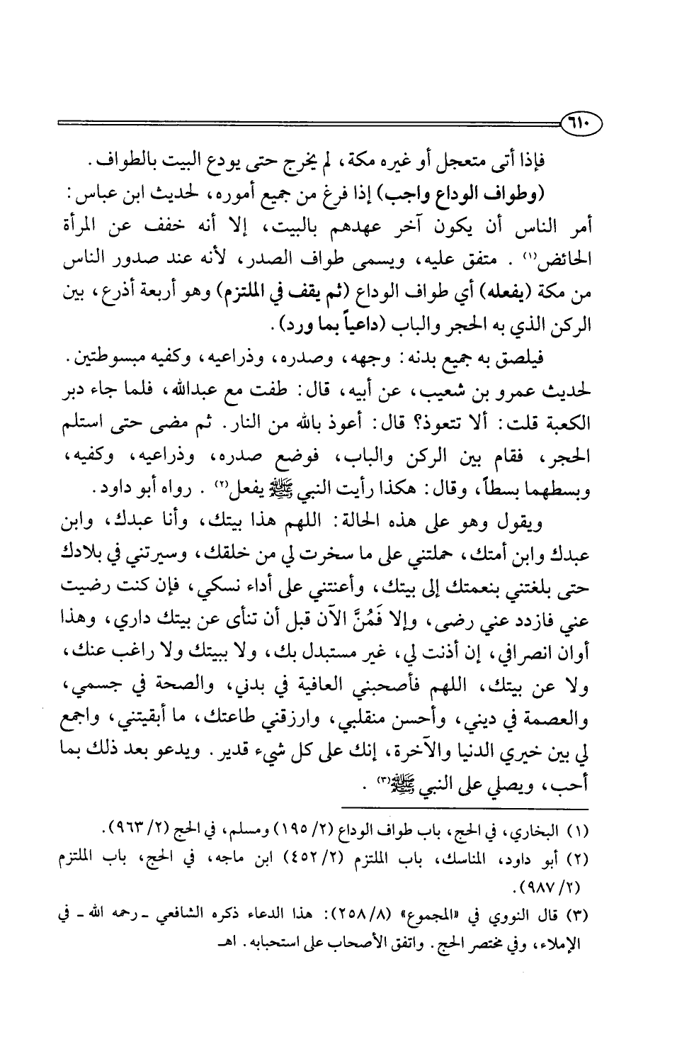 (وطواف الوداع واجب) إذا فرغ من جميع أموره، لحديث ابن عباس: أمر الناس أن يكون آخر عهدهم بالبيت، إلا أنه خفف عن المرأة الحائض (¬1). متفق عليه، ويسمى طواف الصدر، لأنه عند صدور الناس من مكة (يفعله) أي طواف الوداع (ثم يقف في الملتزم) وهو أربعة أذرع، بين الركن الذي به الحجر والباب (داعيًا بما ورد).