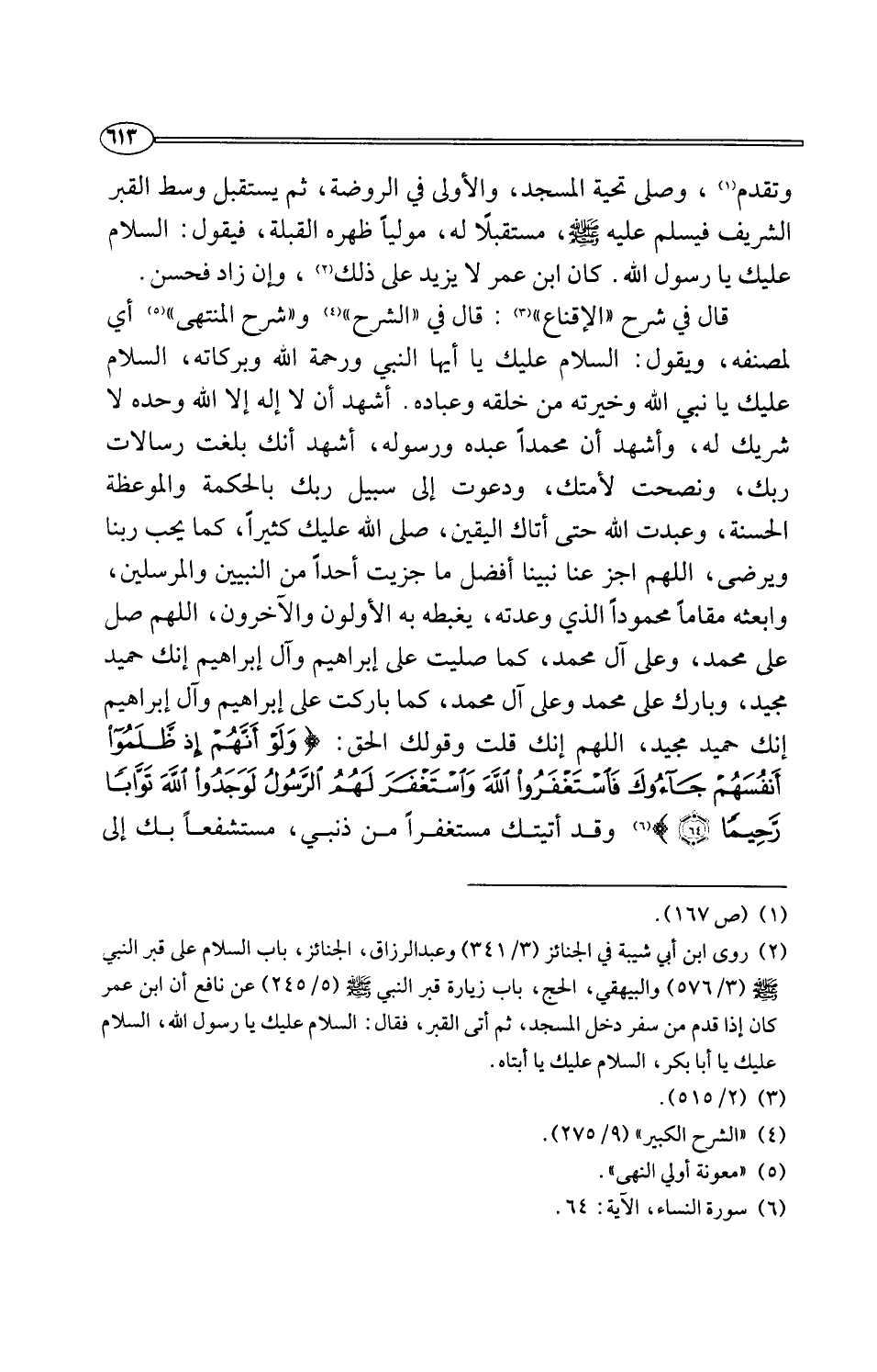 قال في شرح "الإقناع" (¬3): قال في "الشرح" (¬4) و"شرح المنتهى" (¬5) أي لمصنفه، ويقول: السلام عليك يا أيها النبي ورحمة اللَّه وبركاته، السلام عليك يا نبي اللَّه وخيرته من خلقه وعباده. أشهد أن لا إله إلا اللَّه وحده لا شريك له، وأشهد أن محمدًا عبده ورسوله، أشهد أنك بلغت رسالات ربك، ونصحت لأمتك، ودعوت إلى سبيل ربك بالحكمة والموعظة الحسنة، وعبدت اللَّه حتى أتاك اليقين، صلى اللَّه عليك كثيرًا، كما يحب ربنا ويرضى، اللهم اجز عنا نبينا أفضل ما جزيت أحدًا من النبيين والمرسلين، وابعثه مقامًا محمودًا الذي وعدته، يغبطه به الأولون والآخرون، اللهم صل على محمد، وعلى آل محمد، كما صليت على إبراهيم وآل إبراهيم إنك حميد مجيد، وبارك على محمد وعلى آل محمد، كما باركت على إبراهيم وآل إبراهيم إنك حميد مجيد، اللهم إنك قلت وقولك الحق: {وَلَوْ أَنَّهُمْ إِذْ ظَلَمُوا أَنْفُسَهُمْ جَاءُوكَ فَاسْتَغْفَرُوا اللَّهَ وَاسْتَغْفَرَ لَهُمُ الرَّسُولُ لَوَجَدُوا اللَّهَ تَوَّابًا رَحِيمًا} (¬6) وقد أتيتك مستغفرًا من ذنبي، مستشفعًا بك إلى
